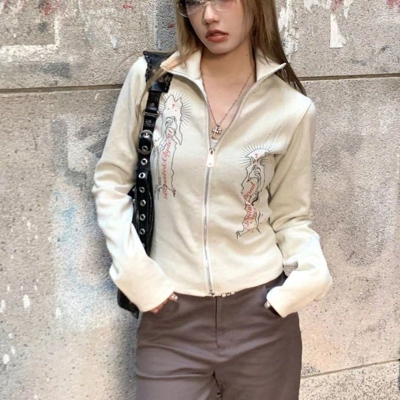 White Stand Collar Virgin Printed Sweater Women's Top