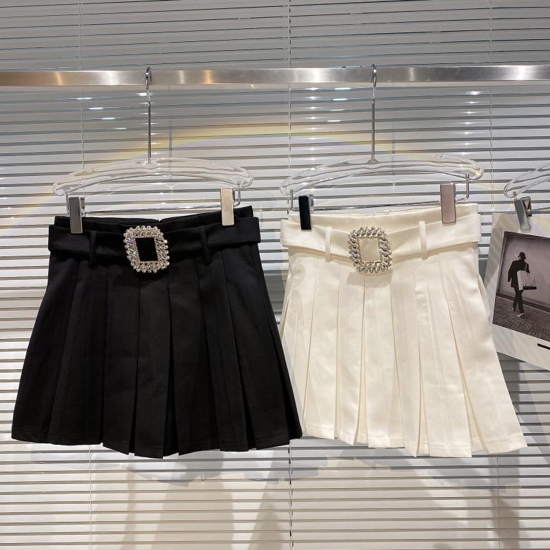 Square Rhinestone Waistband Design Anti Glare Pleated Skirt