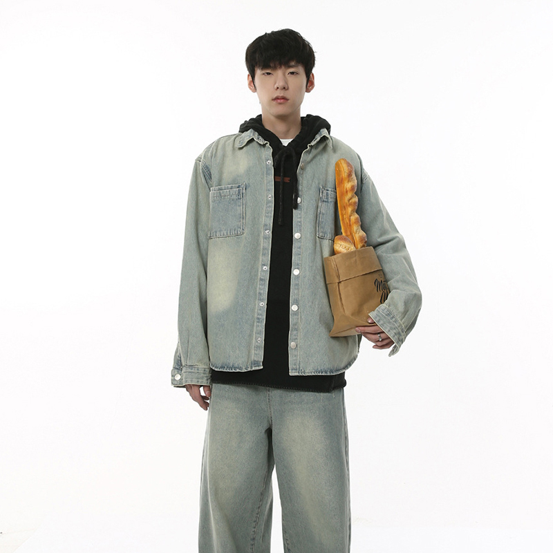 Autumn New Loose Washed-out Brushed White Beef Offal Shirt Coat Trousers