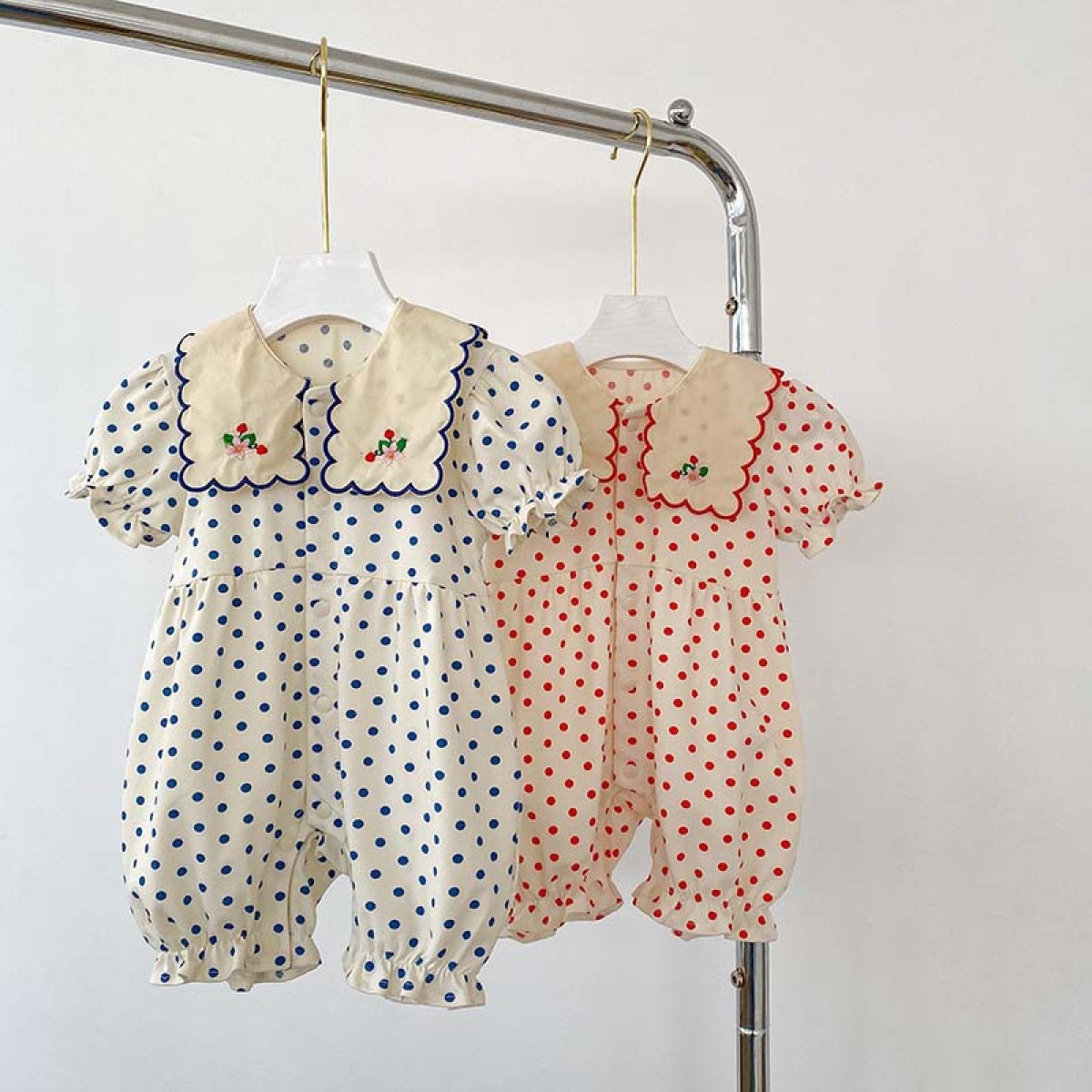 Color: blue dot jumpsuit, red dot jumpsuit