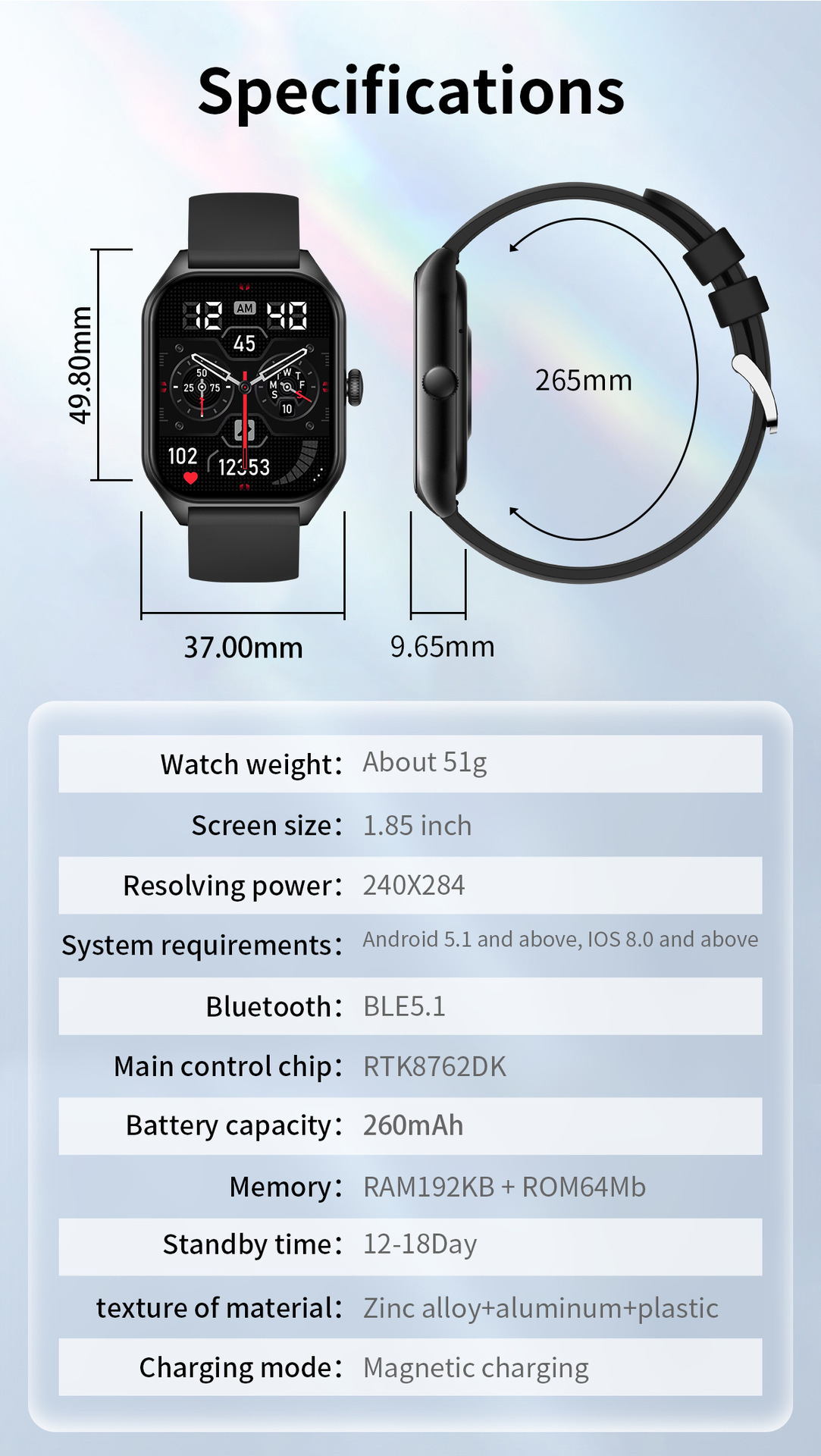 Functions: step counting, heart rate monitoring, blood pressure measurement, Bluetooth calling, smart reminder, sleep monitoring, blood oxygen detection
