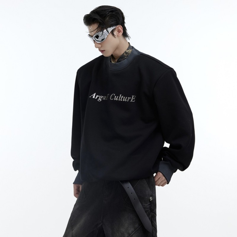 Worn Out Spray Painted Shoulder Padded Round Neck Hoodie