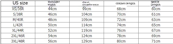Size: US size XS clothes bust 99cm, US size S clothes bust 104cm, US size M clothes bust 109cm, US size L clothes bust 114cm, US size XL clothes bust 119cm, US size 2XL clothes bust 124cm, US size 3XL clothes bust 129cm