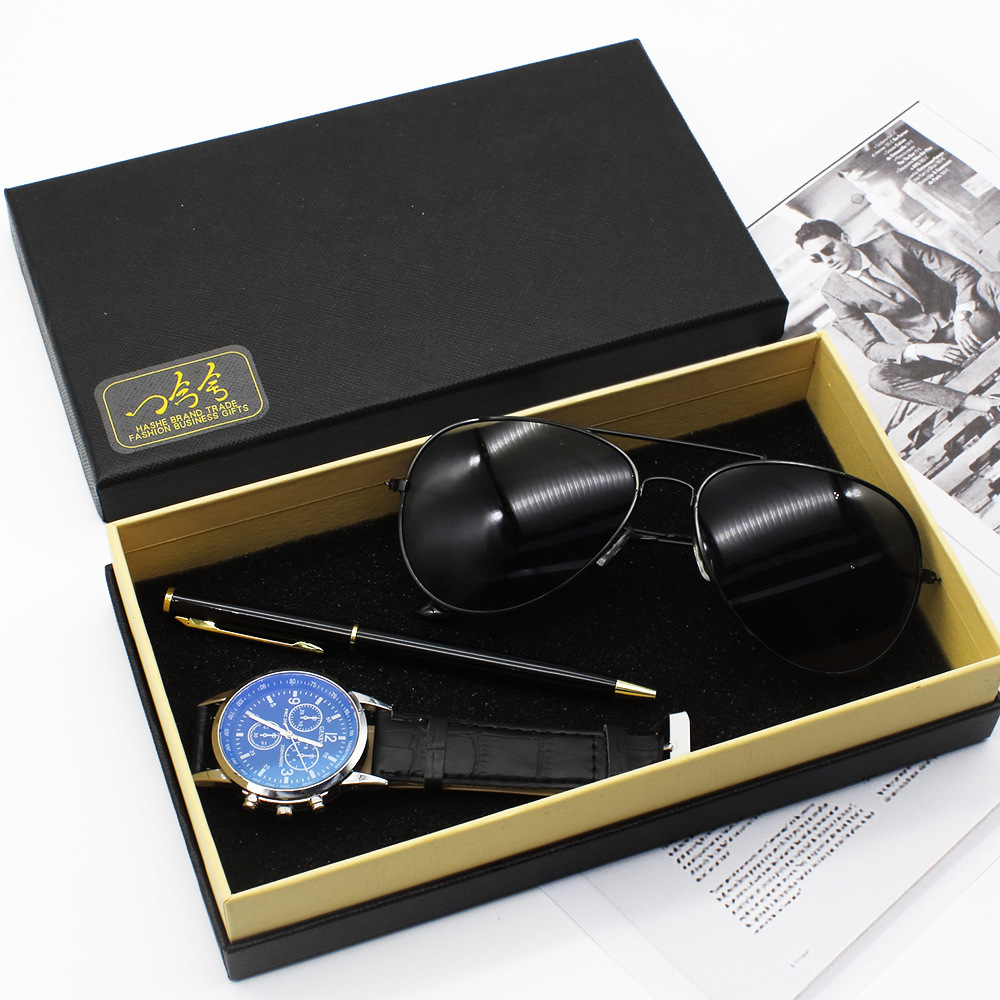 Color: Black Face Brown with watch sunglasses white business Pen gift box, white face Brown with watch sunglasses white business Pen gift box, white face black ribbon watch sunglasses white business Pen gift box, black face black ribbon watch sunglasses white business Pen gift box, black face black strap watch Sunglasses Black Business pen gift box