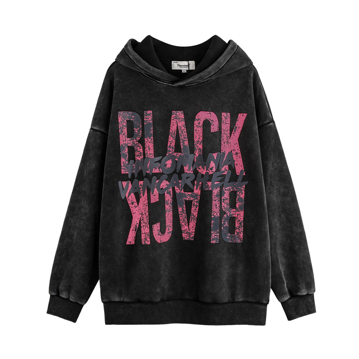 Distressed Letters Printed Velvet Padded Hooded Sweatshirt
