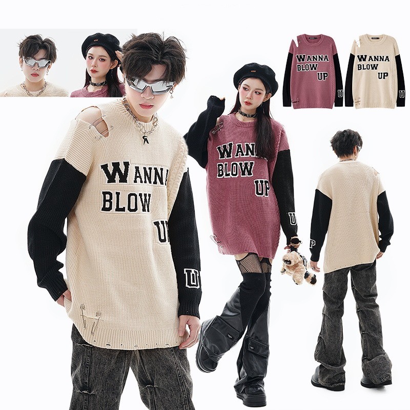 Ripped Pin Embroidered Letter Jacquard Knitted Sweater