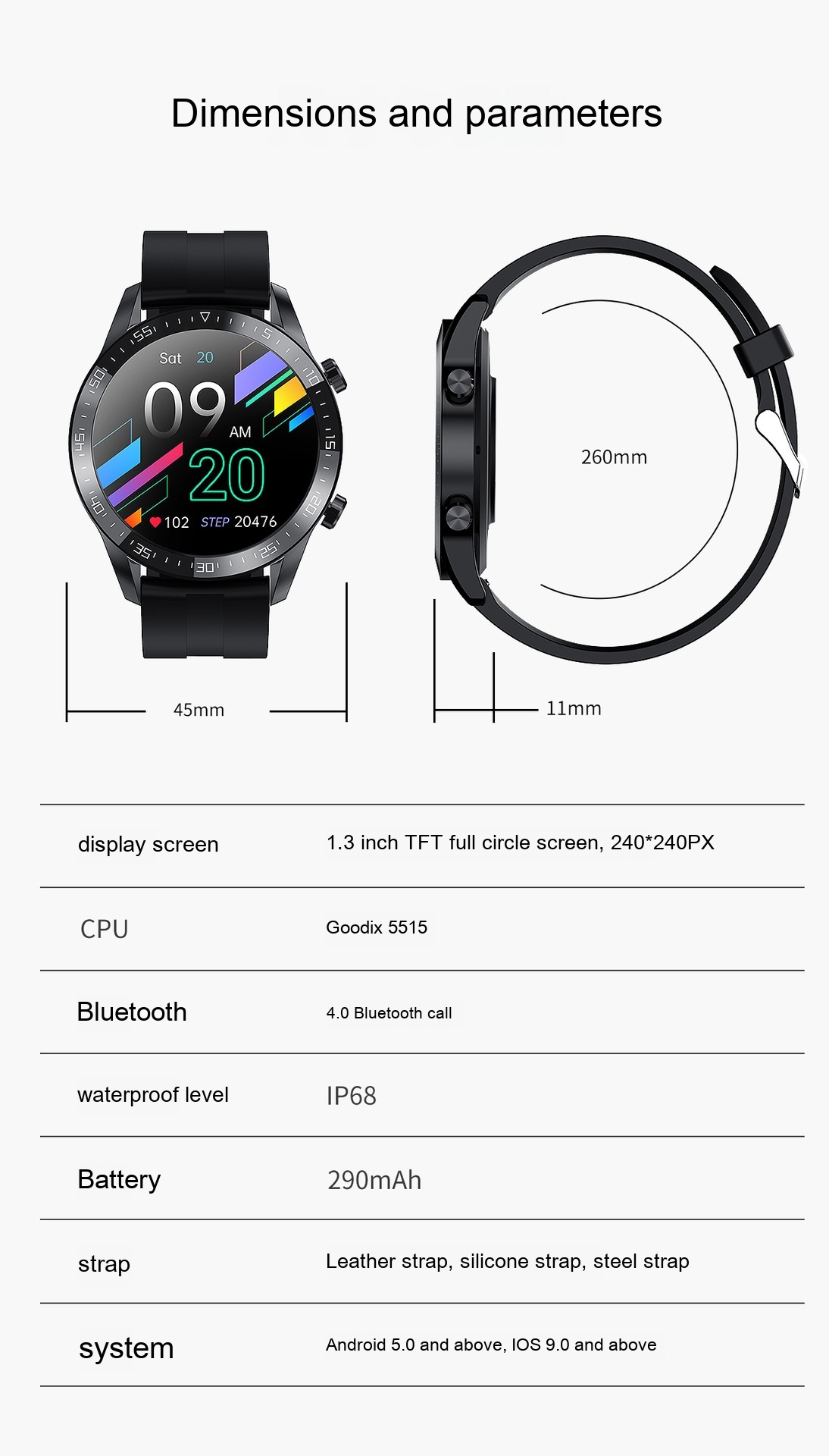 Additional features: step counting, smart reminder, remote control selfie, health monitoring, information push, sleep analysis