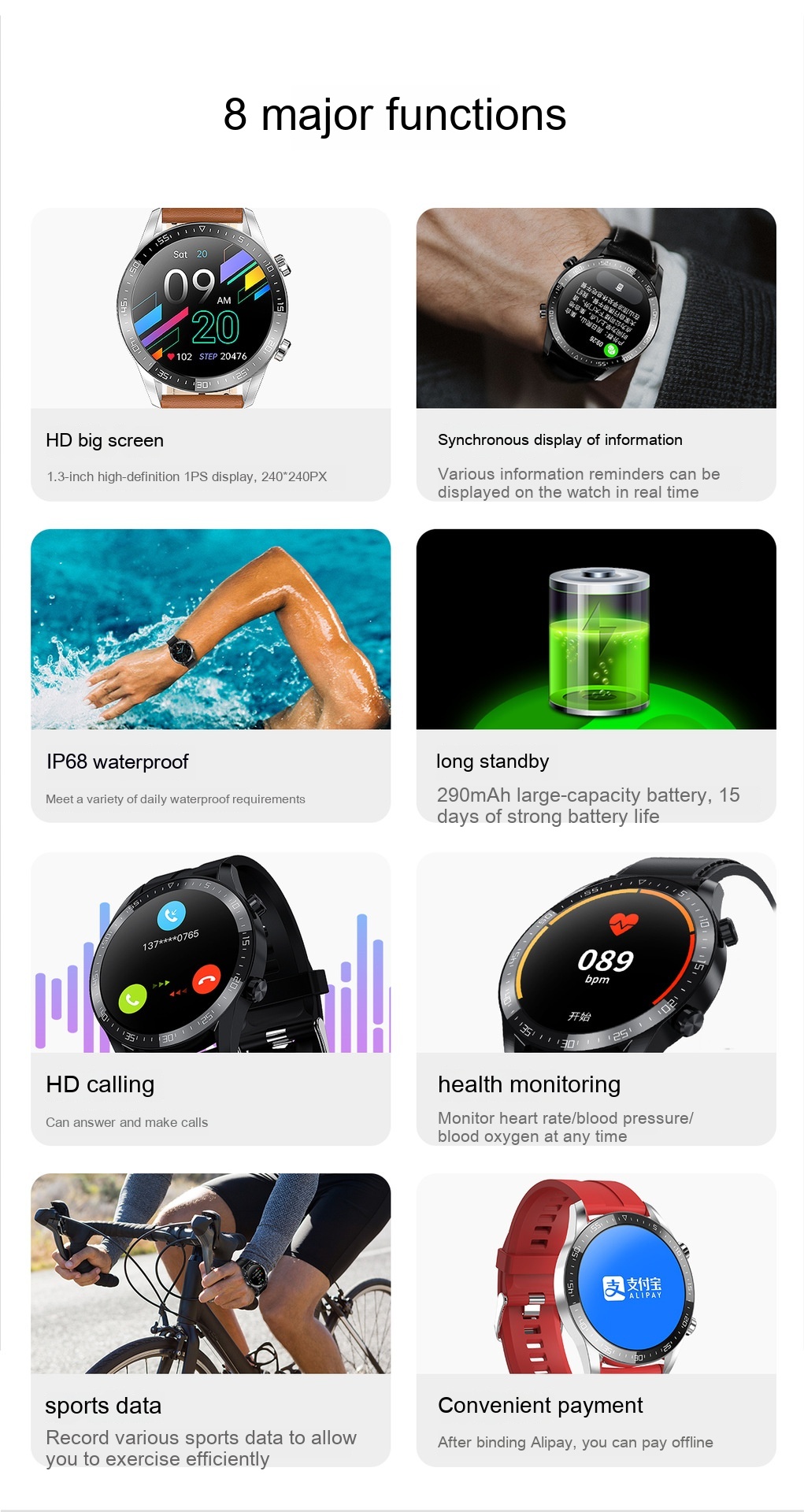 Functions: Waterproof, photo taking, step counting, heart rate monitoring, Bluetooth calling, smart reminder, remote control selfie, information push