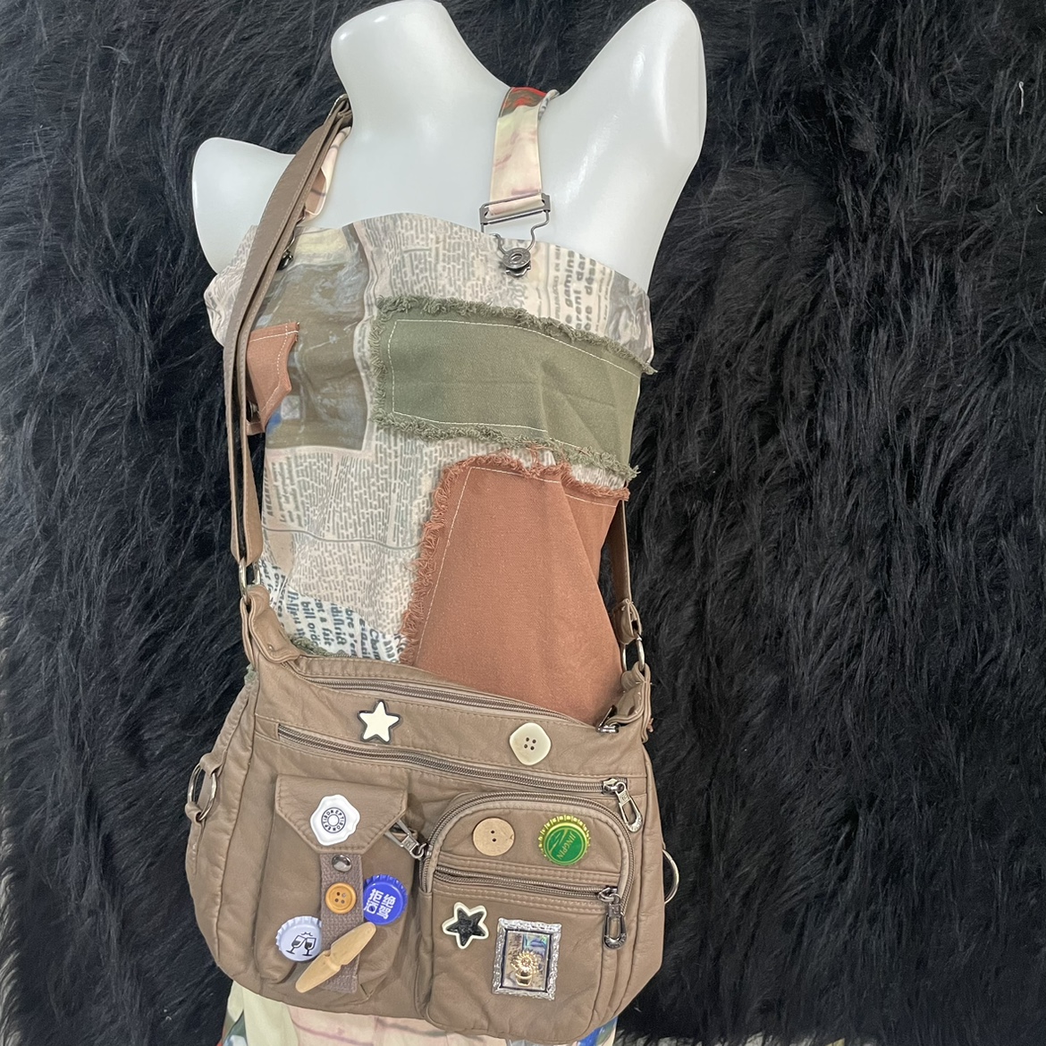 Vintage Button Bottle Cap Patch Messenger Distressed Crossbody Bag