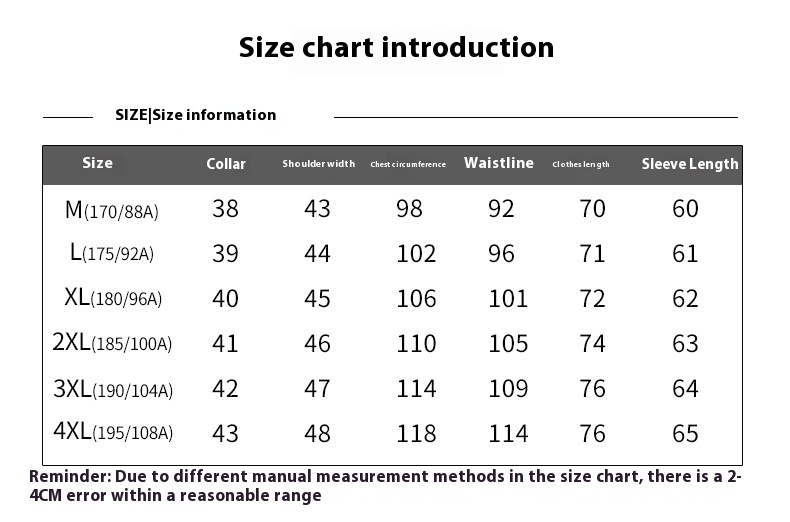 Size: M (recommend 65.00-70.00, L (recommend 65.00-75.00, XL (recommend 70.00-80.00, 2XL (recommend 75.00, 3XL (recommend 160-170kg)),4XL (recommend 85.00-95.00