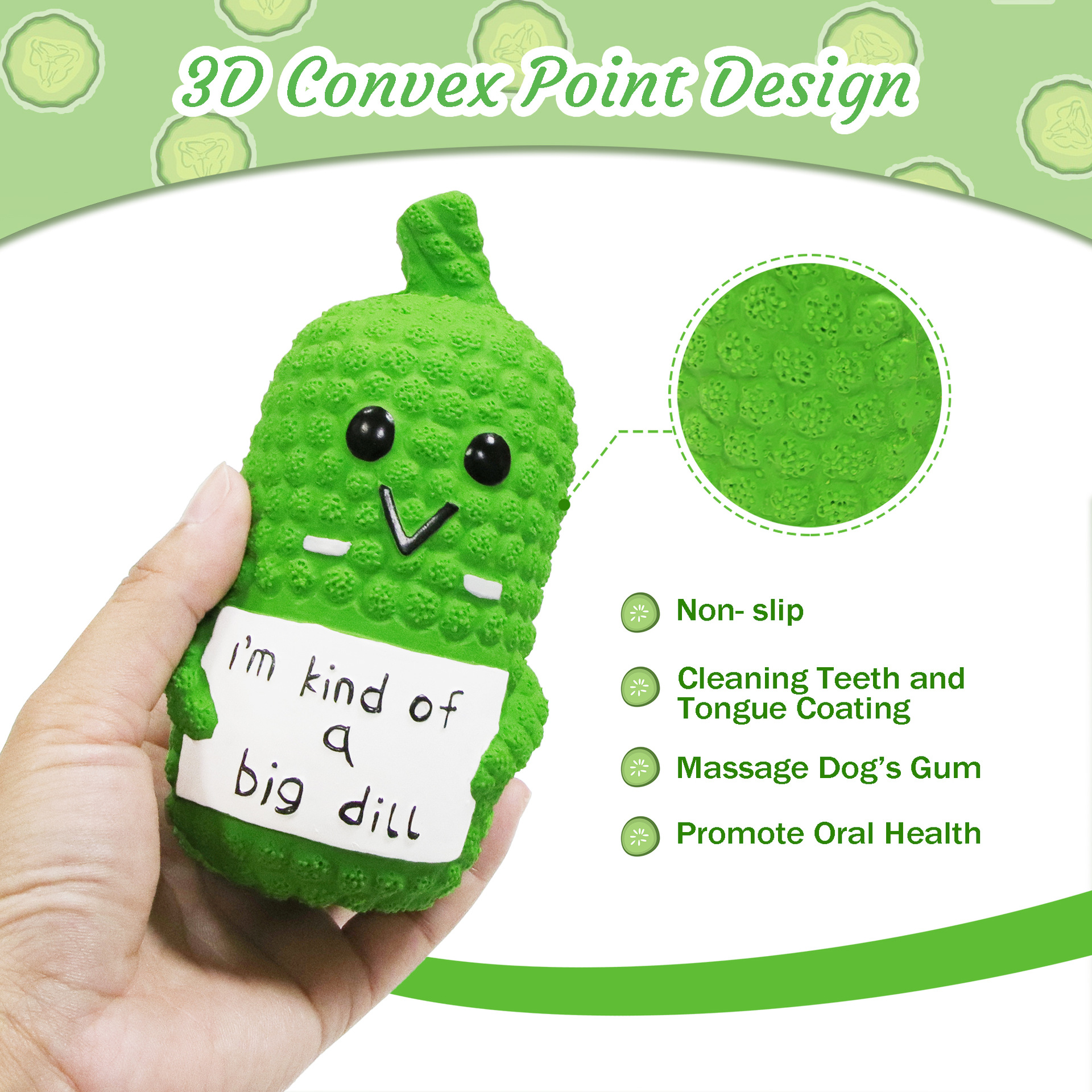The exterior of the pickle features many convex nubs that can help dogs clean the teeth as they chew, reduce the tartar and massage the gums at the same time.