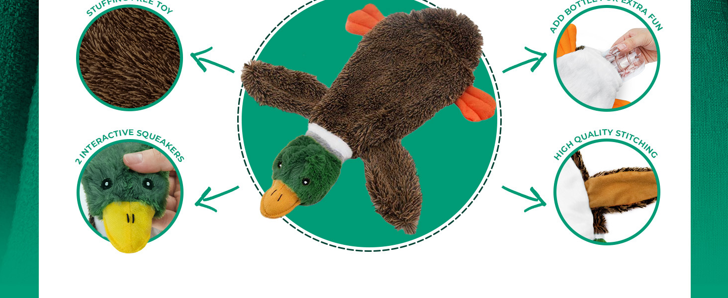 Minimize Mess: With a squeaker in the head and another in the tail, this stuffing-free dog toy makes every bite a delightfully squeaky treat. These squeaky dog toys also have self-fasteners at the bottom that you can open up and place a plastic bottle in to introduce a fun crunch into the mix. No bottle insert space for the small size.