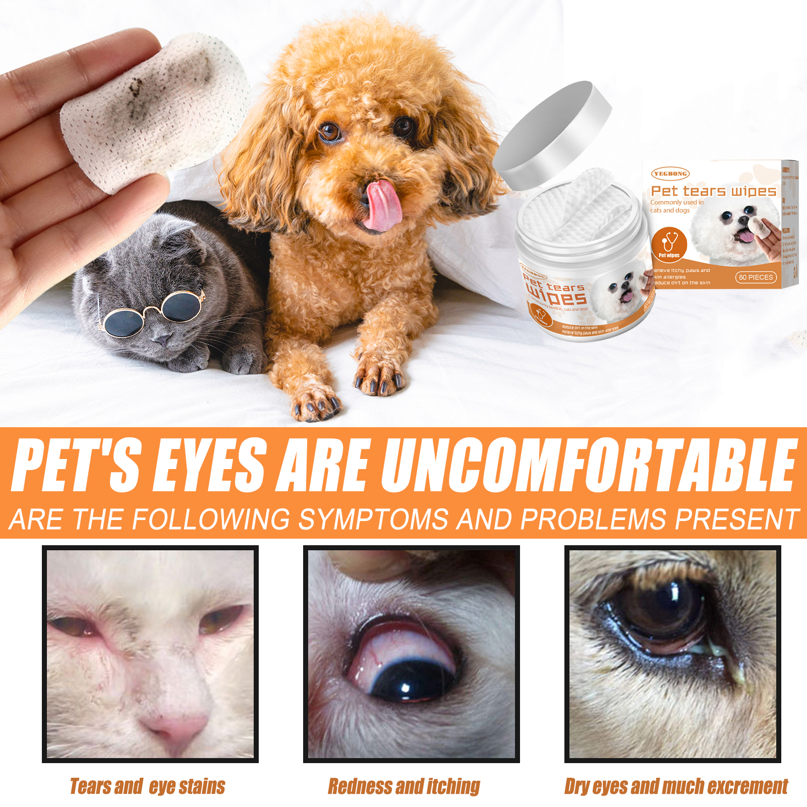 Our pet tear wipes contain aloe vera, glycerin, chamomile extract. It can gently remove tears, prevent dry eyes hypoallergenic without irritation. Its application is simple: the first time you use it, close the lid and remove the sealing film, take out a wet towel and gently wipe around your eyes to remove stubborn stains. And can clean pets.