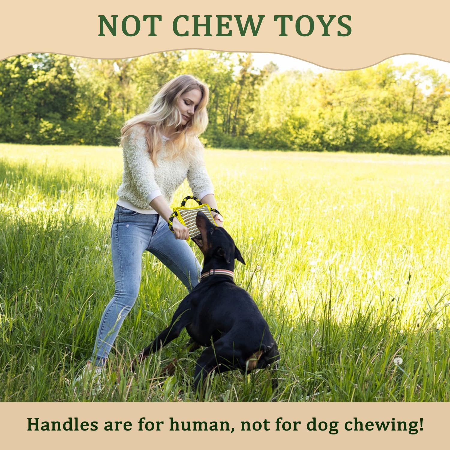 Not a Chew Toy】This dog tug toy is built safe and tough but not indestructible. Tug Toys are meant for interactive tugging between you and your dog only,they could be nice training tool but not chewable.Please put away the toy out of the dog's reach after not let your dog bite the rope handles!