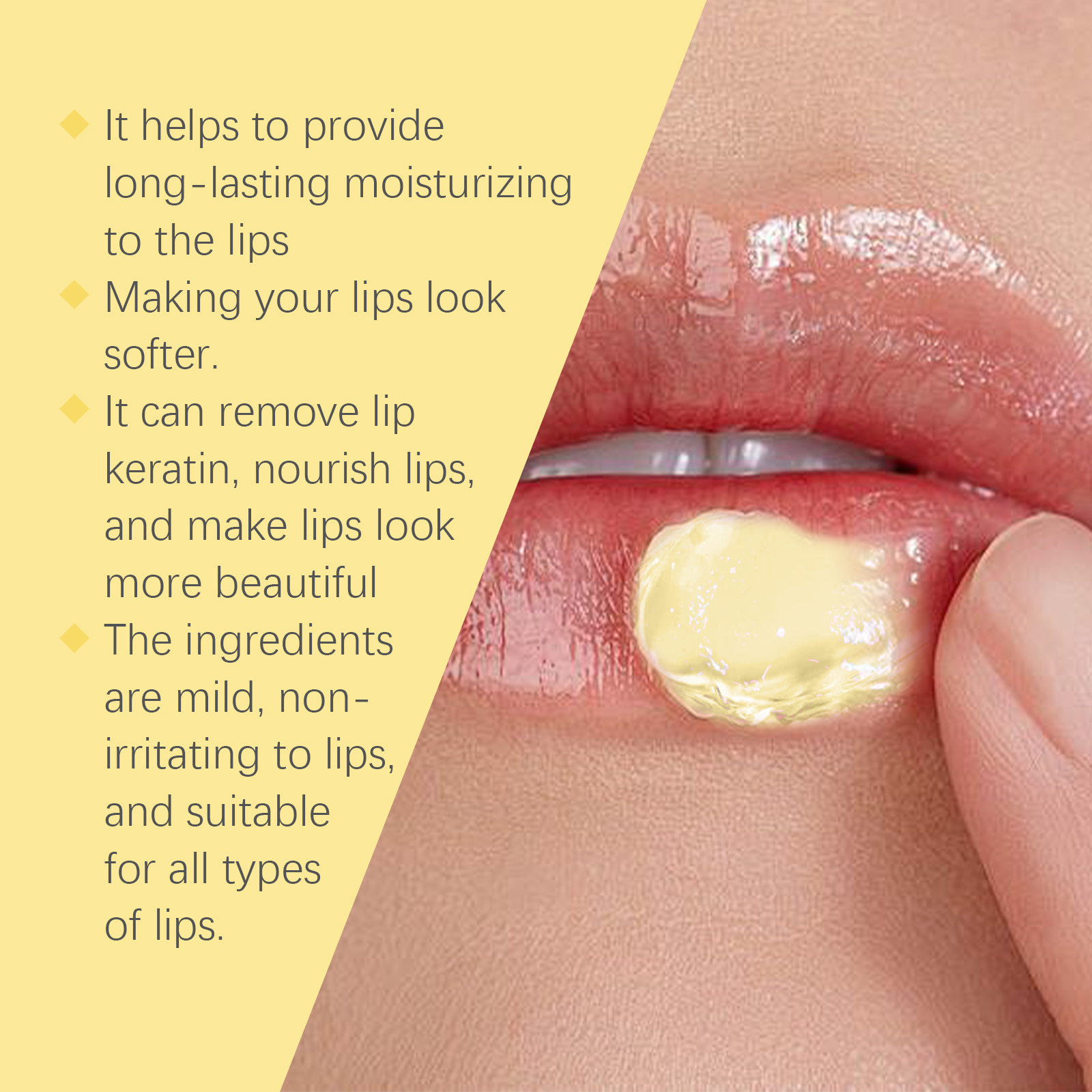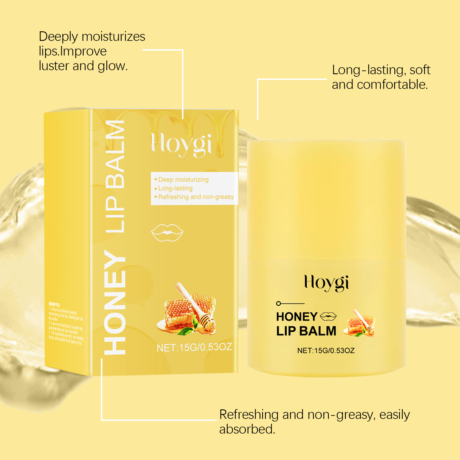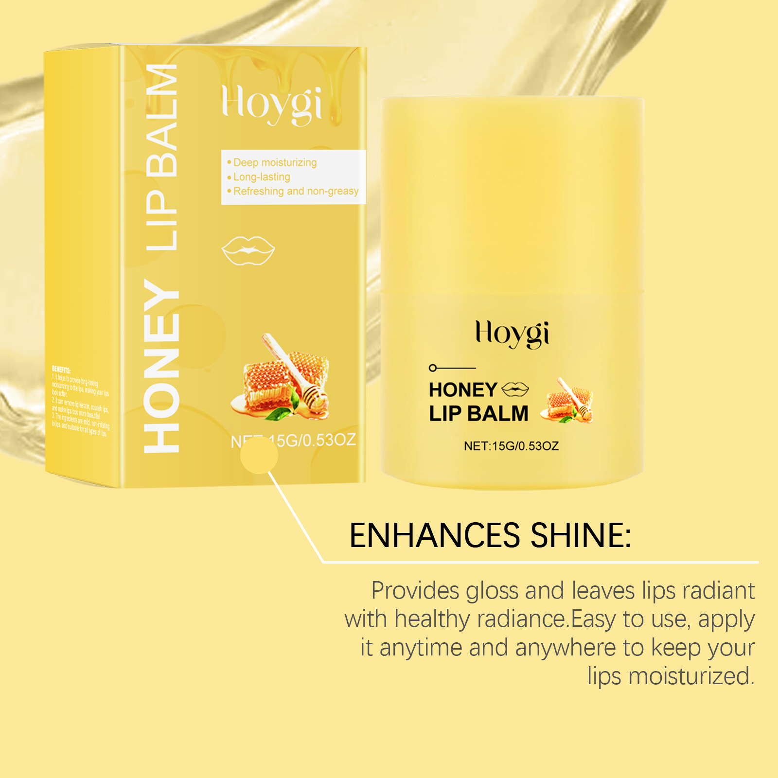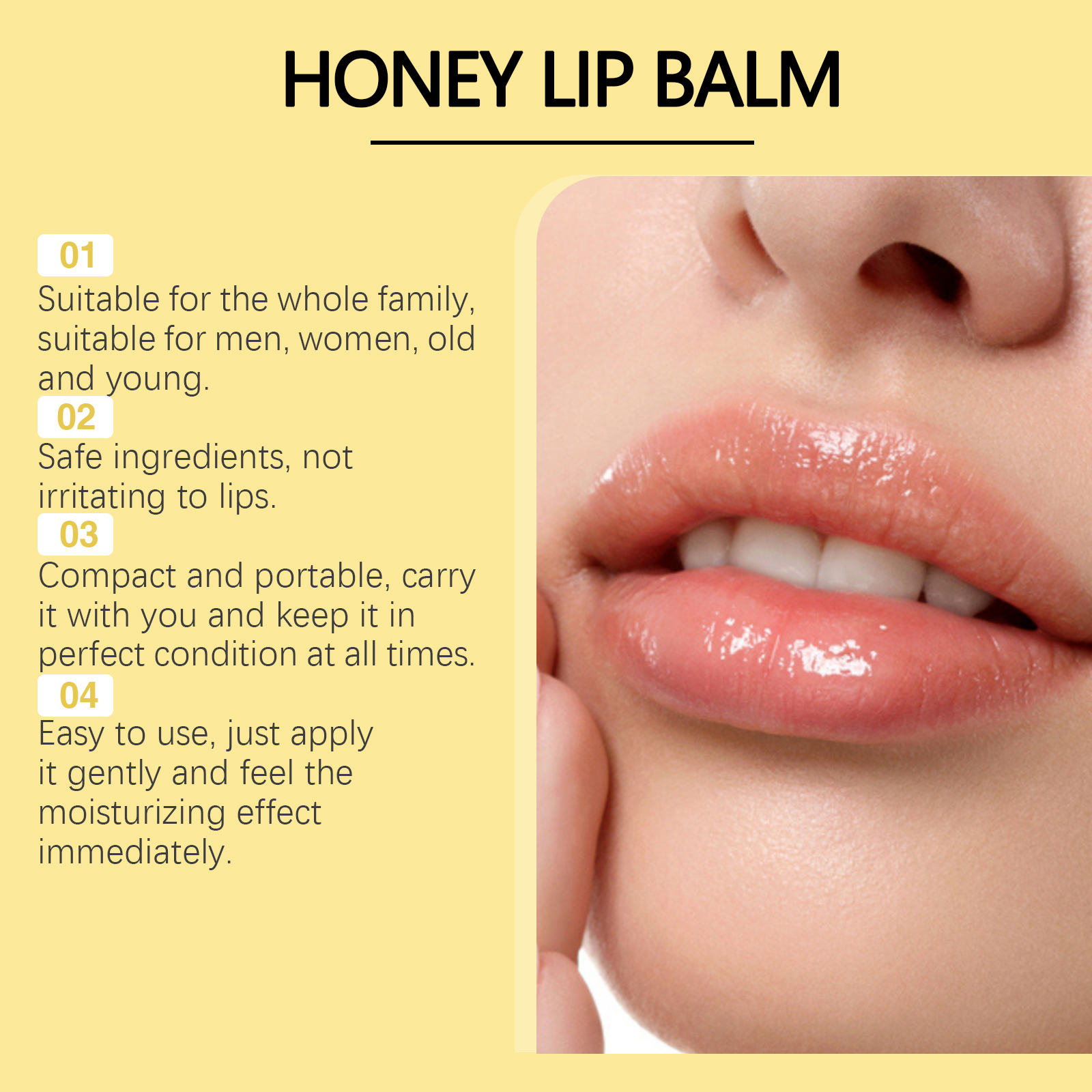 Our Honey Nourishing Lip Balm contains glycerin, propolis extract, honey. It deeply moisturizes lips and prevents dryness and chapping. Long-lasting hydration to keep lips soft and comfortable all day long. Its use is simple: 1. Clean your lips and keep them dry. 2. Take an appropriate amount of this product and apply it evenly to the lips. The formula is lightweight, fast-absorbing, non-greasy and comfortable to use.