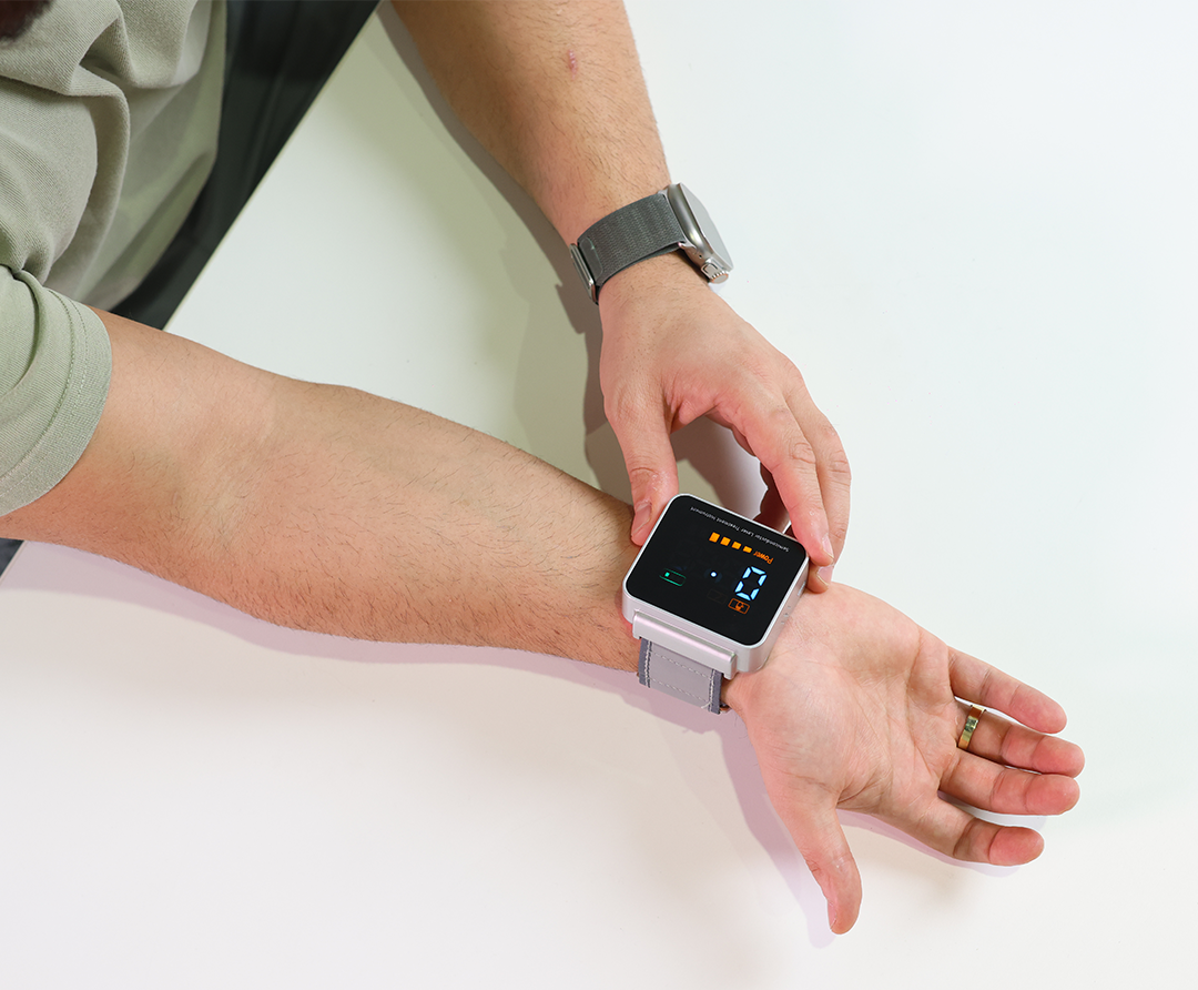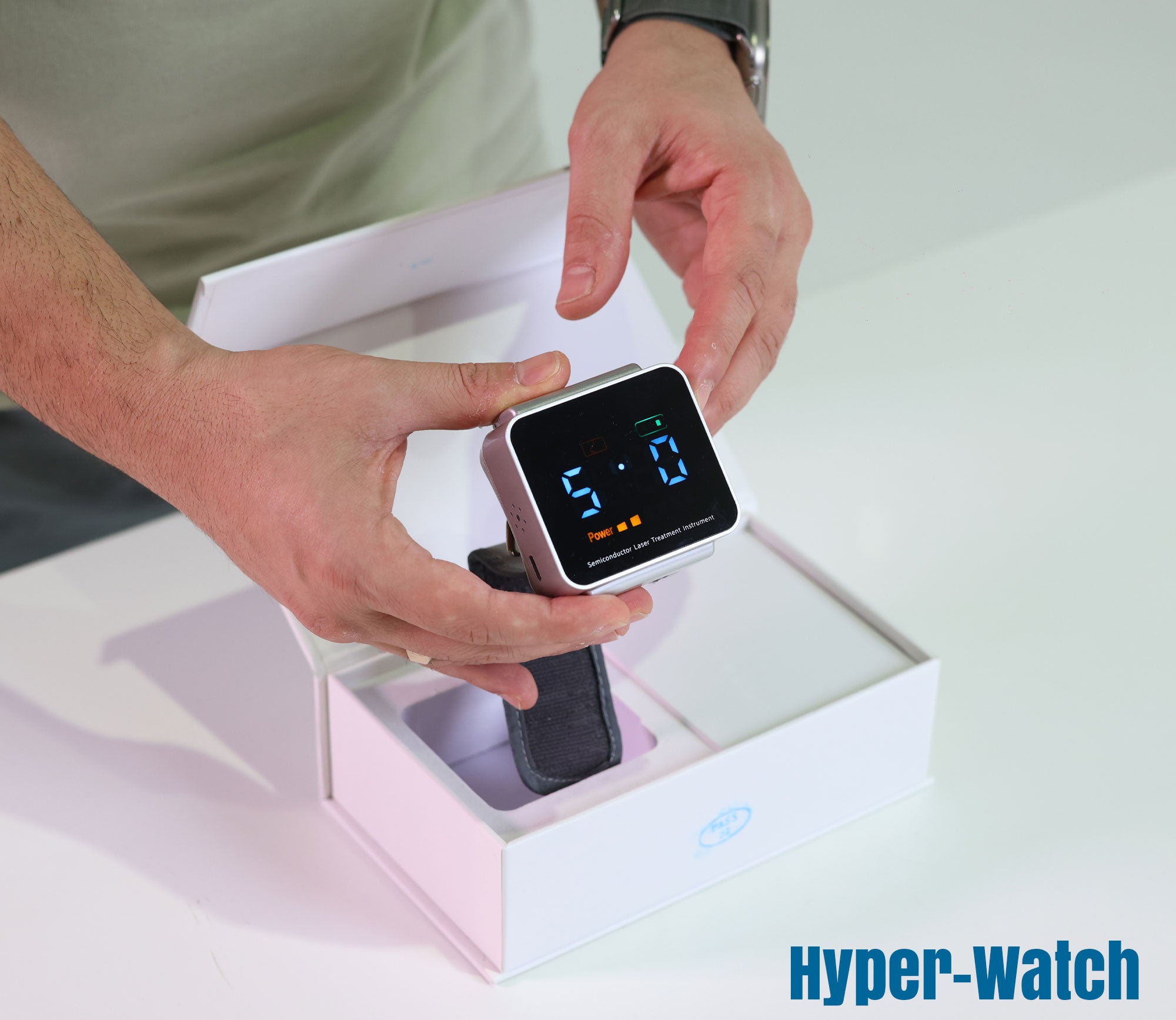 The Hyper-Watch uses low-intensity red light (650nm) applied tocommonly targeted wellness areas on the wrist, a modern take on ageold relaxation techniques.