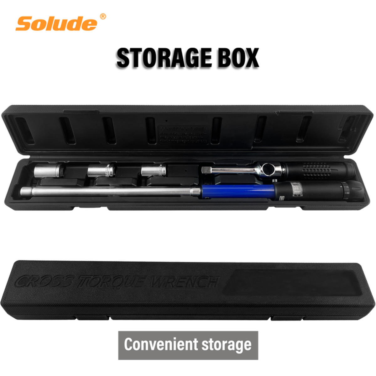 Design: The surface of the box is printed with the words "CROSS TORQUE WRENCH", which clearly identifies the product type and facilitates user identification. The lid and body of the box are tightly connected by a buckle, making it easy to open and close. After closing, it ensures that the storage box will not accidentally open, ensuring the safe storage of tools. In addition, there are specialized grooves inside the box according to the shape of the wrench and socket, making the tools neatly arranged and easy to access.