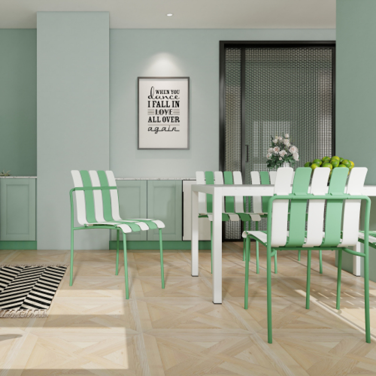 Product Name:4-Pack Modern Striped Color Block Chairs - Waterproof PP Seat & Sturdy Metal Legs, Indoor/Outdoor Dining Set for Patio, Balcony, Café (White & Green)