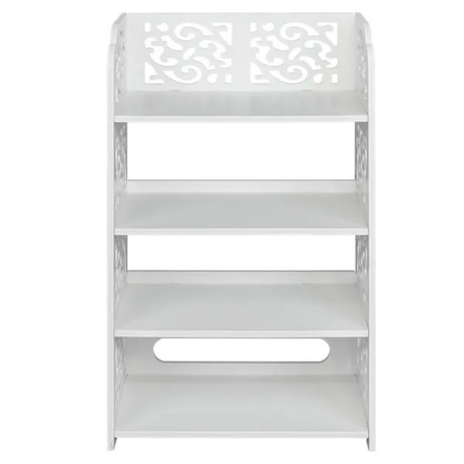 Are you looking for a practical rack to organize your shoes? If so, this Wood-plastic Board Four Tiers Carved Shoe Rack is highly recommended to you. It adopts wood-plastic board, which is smooth and beautiful. It also features waterproof, damp proof, easy to clean and not easy to become mildewed. With hollow design, it's suitable for many occasions, like living room, hall, study, bedroom, etc. Moreover, it's easy to install with no tool needed. So what are you waiting for? Just take this practical bookshelf home!