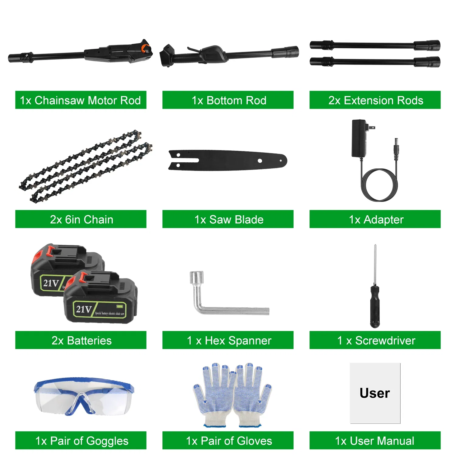 Assembled Chainsaw Size(With 2 Extension Rods& Battery): 12*8*226cm/4.72*3.15*88.9in