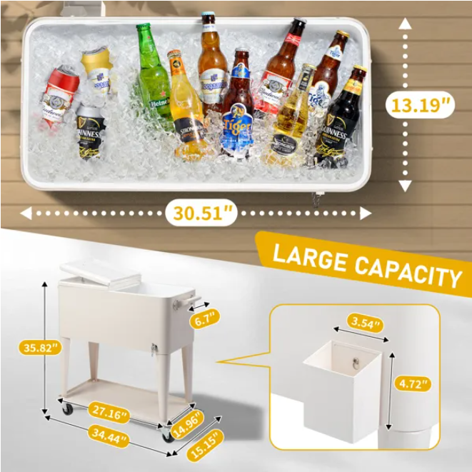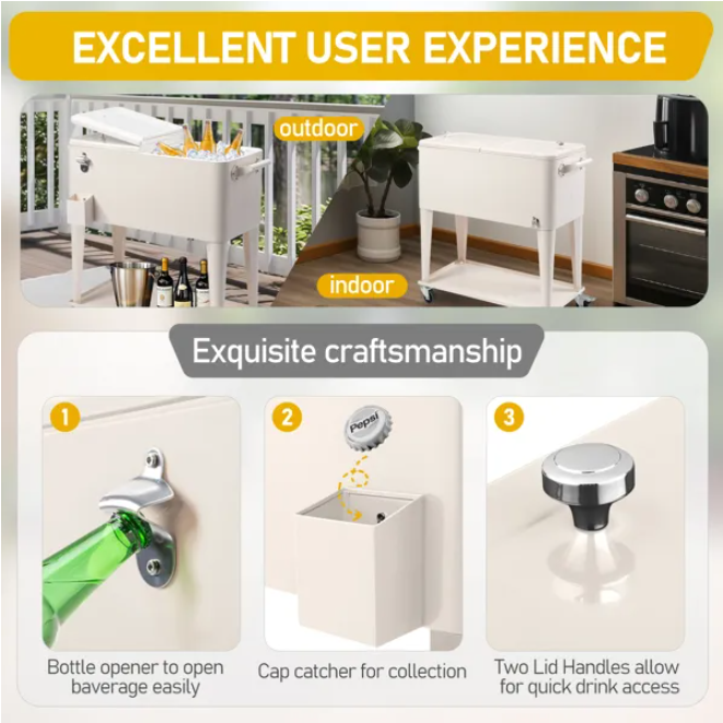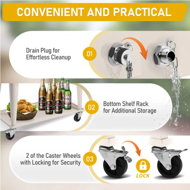 Level up your outdoor events with an all-in-one cooler cart! Fit all the cool refreshments you need with a large, 80-quart fill capacity, and the lower shelf provides extra space for extra beverages or other items you wish to store. Its insulated basin keeps your beverages cold for multiple hours with its injected molded insulation technology. The bottle opener and cap catcher help you easily remove and collect the caps, and the sturdy wheels provide easy mobility when the cooler is full with its locking casters. The drainage cap make it so convenient to clean up the cooler in a nap. Entertain yourself and your guests with this beautiful and high-quality rolling cooler cart!