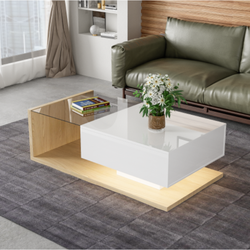 Product Name:Coffee table in high gloss white and wood color combination. Side tables, coffee tables with glass and LED