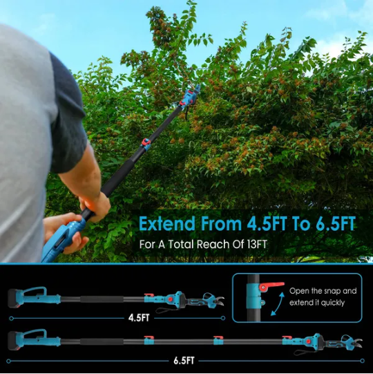 *2-In-1 Pruning Shear with Pole*:Our 2-in-1 electric pruning shear with pole is an ideal solution for maintaining your outdoor garden and yards. Cordless handheld shear is suitable for low-level work,such as trimming hedges,bushes,or small trees near the ground. After connecting to extension pole,it’s effortless for you to reach high-reach area,like tall trees,trim upper branches,or reach over fences.