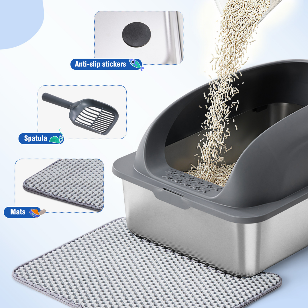 Perfect Combination: Cat litter box stainless steel at the entrance of the litter box effectively filters litter from your cat's claws, keeping floors clean and saving litter. Side litter scoop and wall-mounted scoop holder make it easy to thoroughly clean the litter box.
