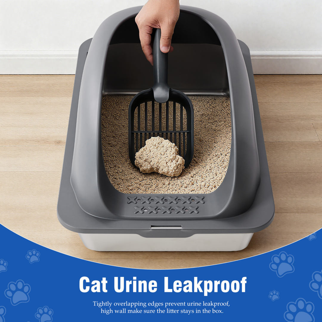 Easy to Clean: The steel cat litter box is large enough, so you don't have to worry about changing the litter while you are working. The high sided cat litter box is made of rust-free material, not easy to stick to urine and feces, and comes with a scoop for quick sifting, making it easy to clean the litter box thoroughly.