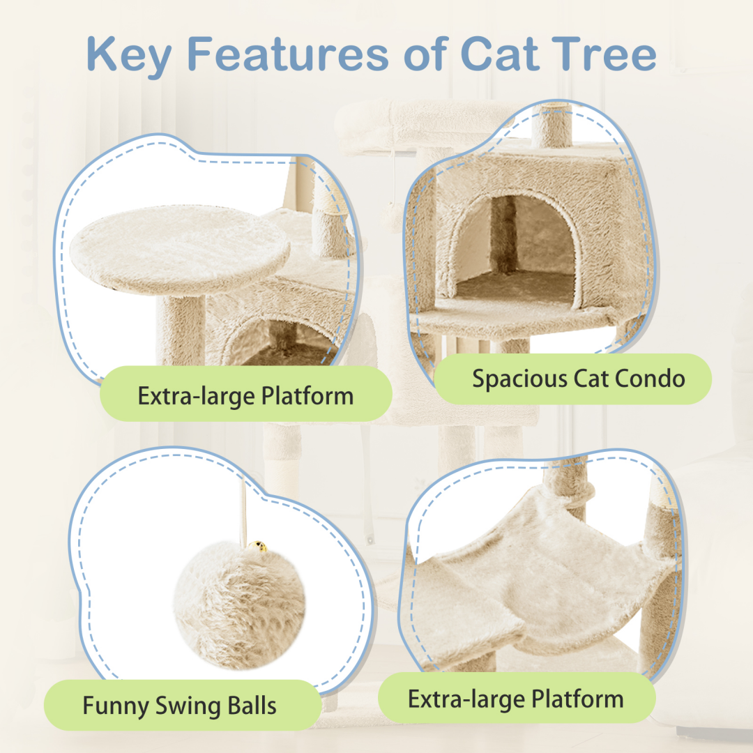 Multi-Level Cat Tree: Multi-zone design caters to feline play needs, specifically crafted for multi-cat households. 44 inch cat tree accommodates 2-3 cats for simultaneous play and relaxation. Features include a cat condo, 2 swinging balls, 2 extended platforms, hammock, and scratching posts, satisfying your cat's instincts to climb, perch, and hide while delivering endless fun