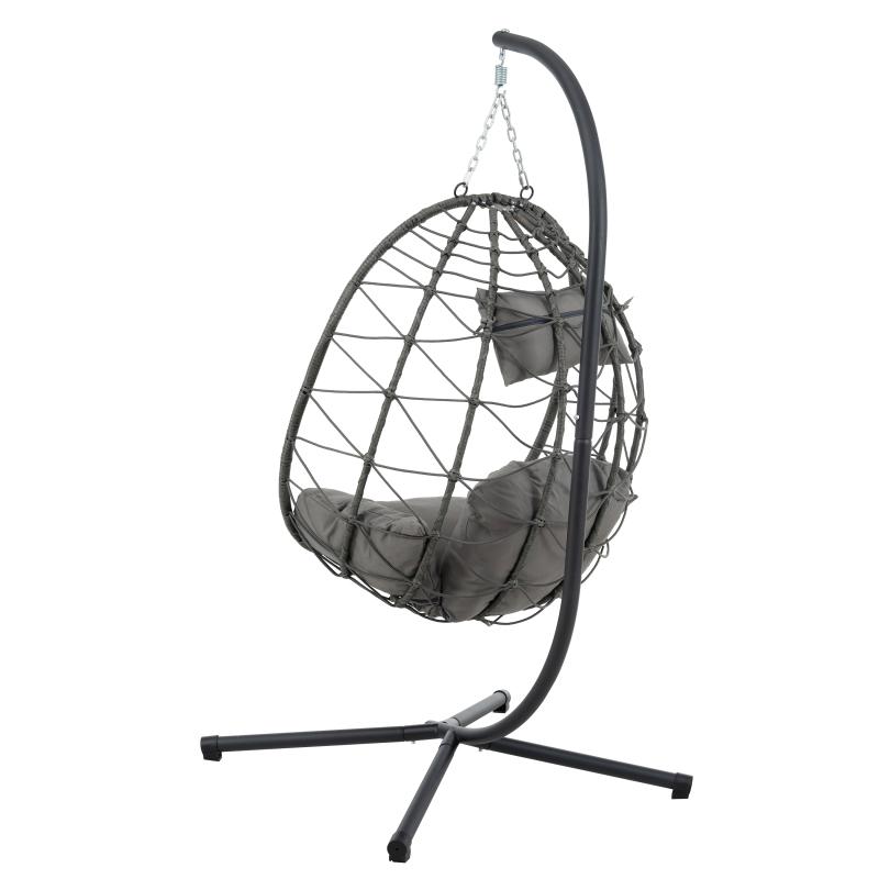 The frame is made of metal tube, with PE wicker rattan, Polyeter Fibre Hand woven. the cushion stuffing is polyester fiber, it can support long time crash. Specifications: Color: Dark Grey Material: PE Wicher, Metal Tube, Plastic End Cap. Product Dimensions: W38.6*D36.2*H76.8 INCHES Weight :47.4 lb Package Included: 1 x Hanging Egg Chair