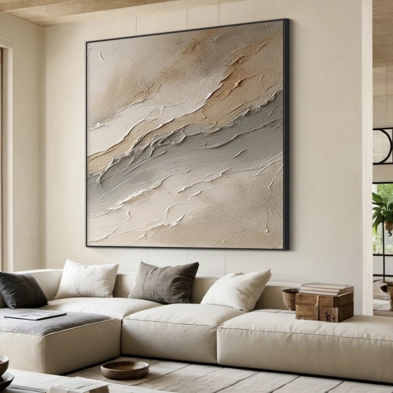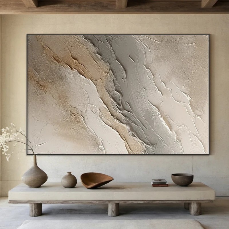 Hand-Painted Oil Painting Canvas Wall Art Decoration Original Art Beige Grey Abstract Texture Waves For Home Living Room Decor Rolled Frameless Unstretched Painting