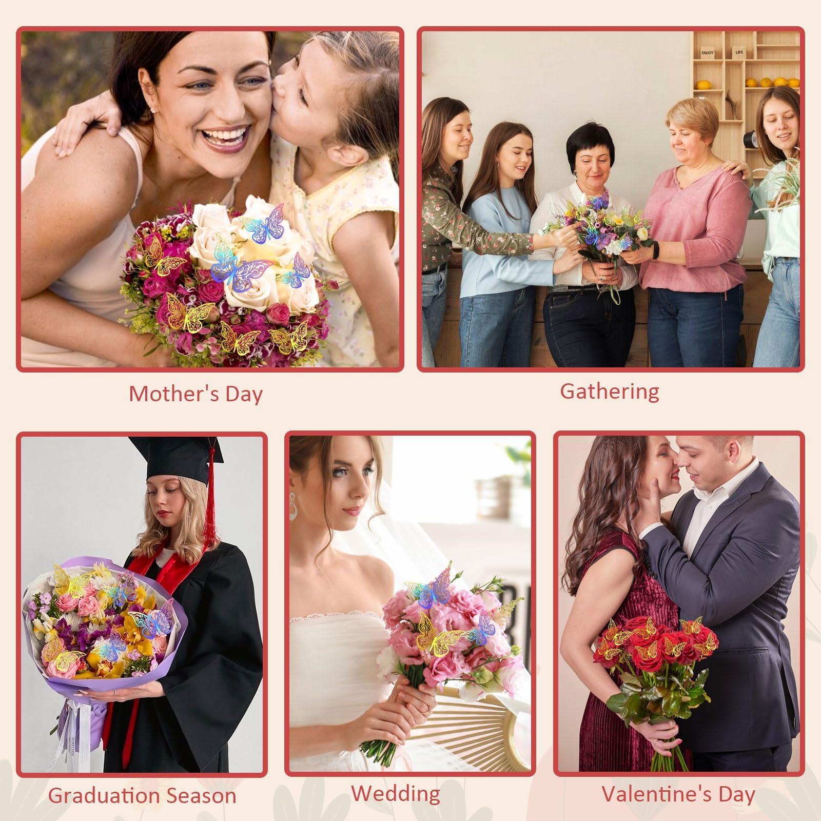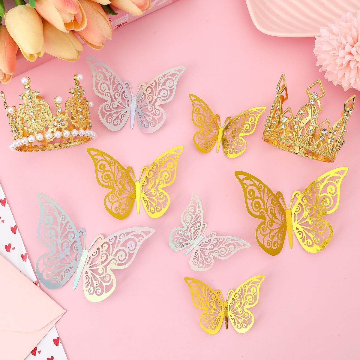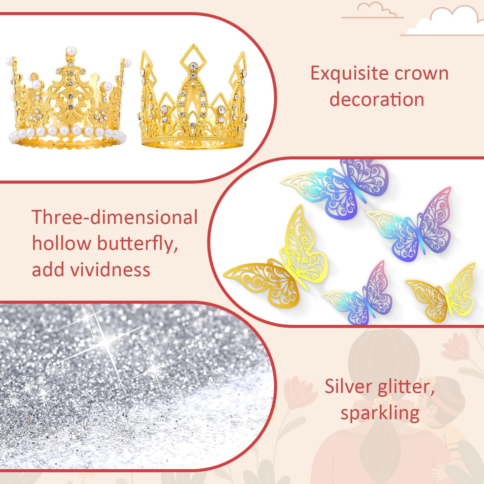 The crowns for flower bouquets set adds a gorgeous and dreamy decorative effect to your bouquet. The flower bouquet accessories set includes 2 gorgeous gold crowns, 24pcs 3D hollow butterflies (12 gold and 12 colorful), and 2 tubes of shiny silver glitter powder (6g per tube). Each bouquet accessories are carefully selected to showcase reliable quality and exquisite craftsmanship.
