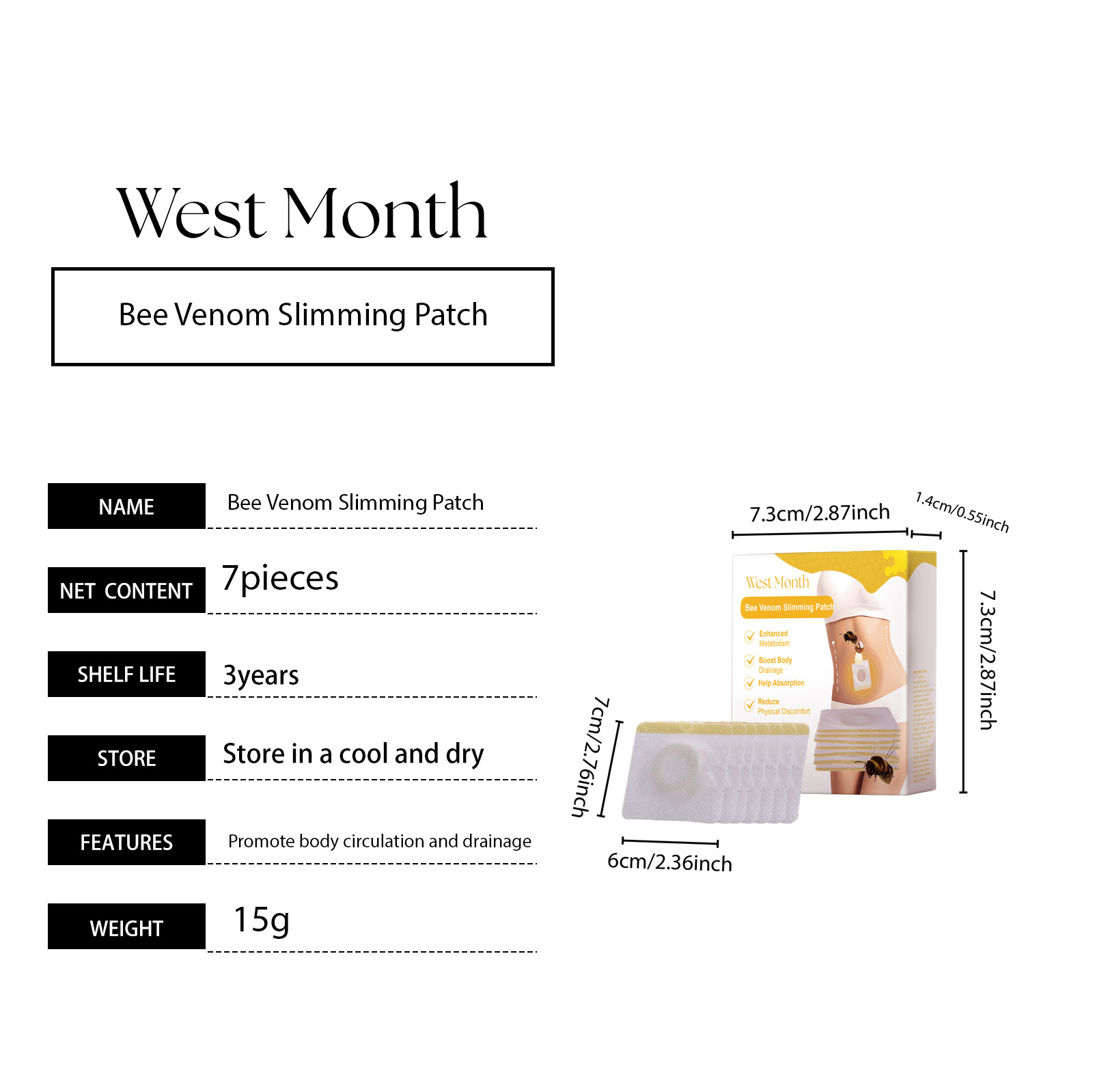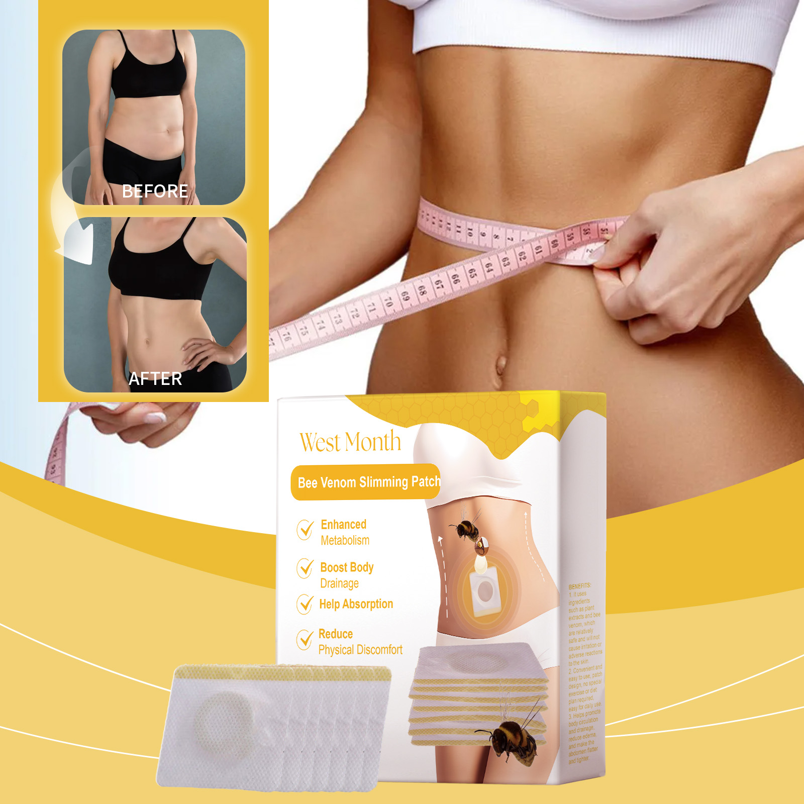 Our bee Venom slimming patch contains bee venom, wormwood and black pepper extract. It can promote body circulation and drainage, reduce edema, make the abdomen flat and firm; Support reduces abdominal discomfort and provides comfort; Promote abdominal blood circulation and increase metabolism. Fit the skin, not easy to fall off when sleeping, uncomfortable, does not affect the appearance. Its use method is very simple: 1. Wash the abdomen and keep dry; 2. Point the patch at the abdomen and press gently to ensure good adhesion; 3. Wait 3-4 hours, then remove. Bee Venom Slimming patch is designed to improve abdominal blood circulation and boost metabolism. Provides continuous comfort and reduces abdominal tightness. Highly absorbent formula, non-greasy skin after use.