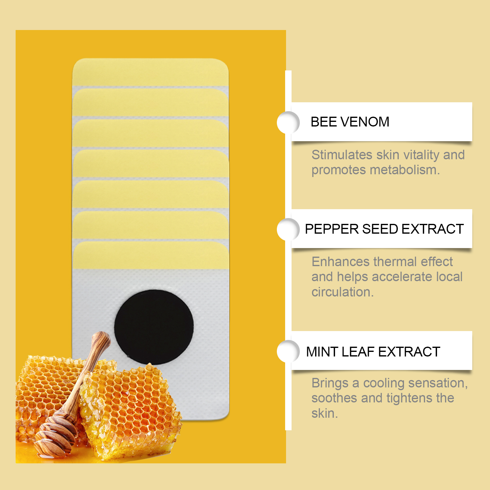 Our bee Venom Body shaping patch contains bee venom, peppercorn-seed extract, mint leaf extract. It can promote local microcirculation and restore skin vitality. Improves skin texture and makes skin smoother. Helps to show the natural curves of the body and boost confidence. Its use method is very simple: 1. Wash the abdomen and keep it dry. 2. Remove the patch and place it on your abdomen, pressing gently to ensure adherence. 3. Wait 3-4 hours and then remove the patch. Mild formula, suitable for all skin types, safe to use. No sticky residue. Skin feels fresh and comfortable after makeup removal.