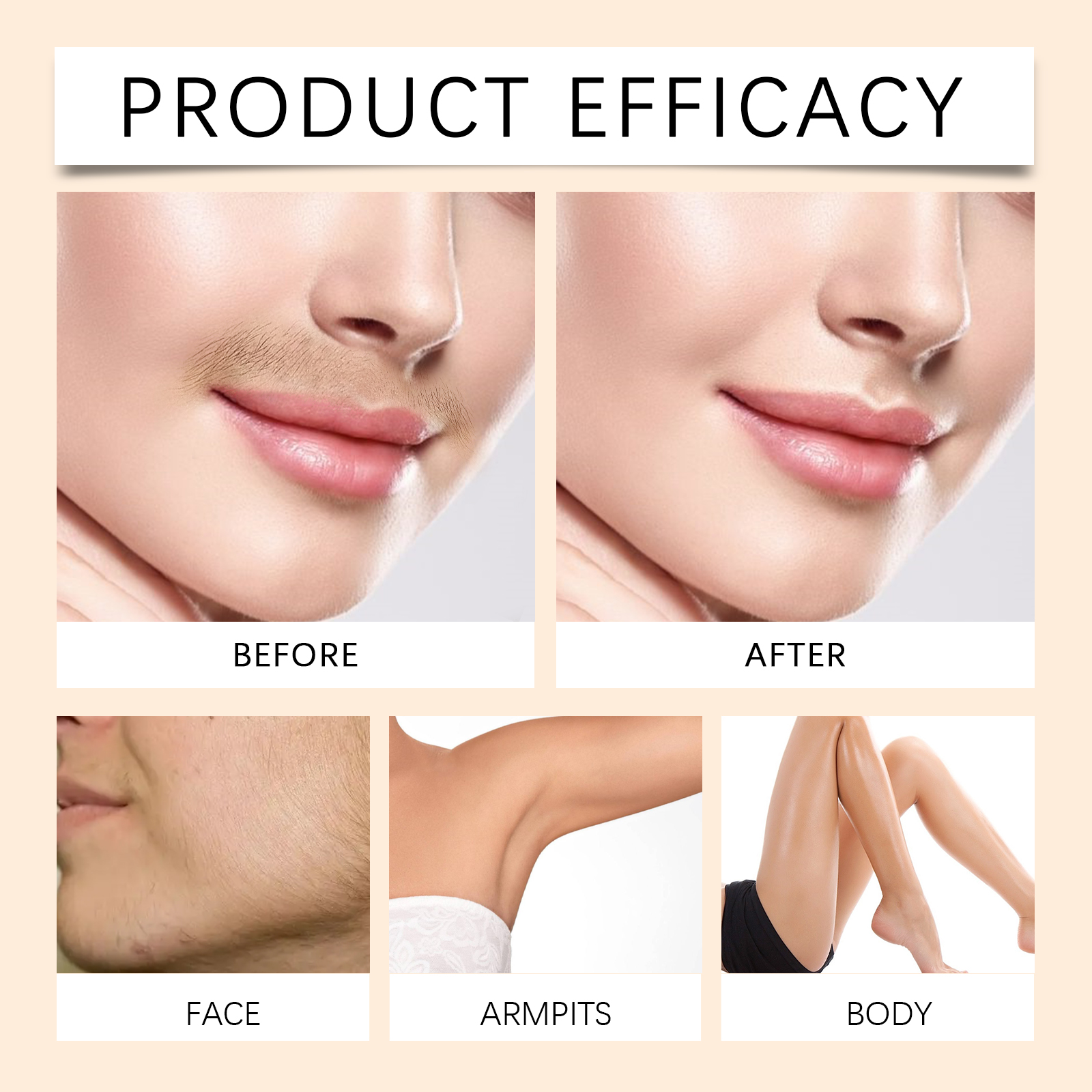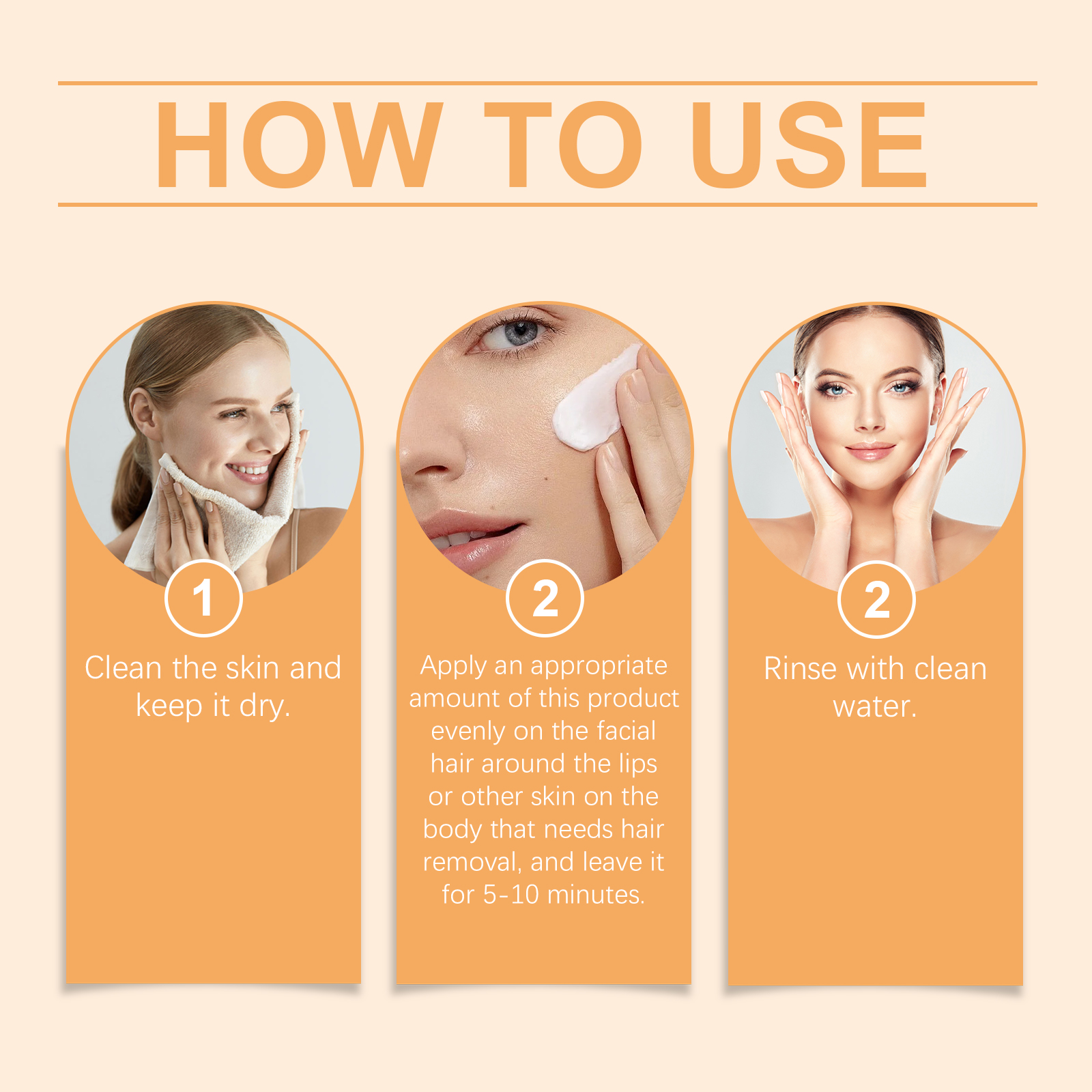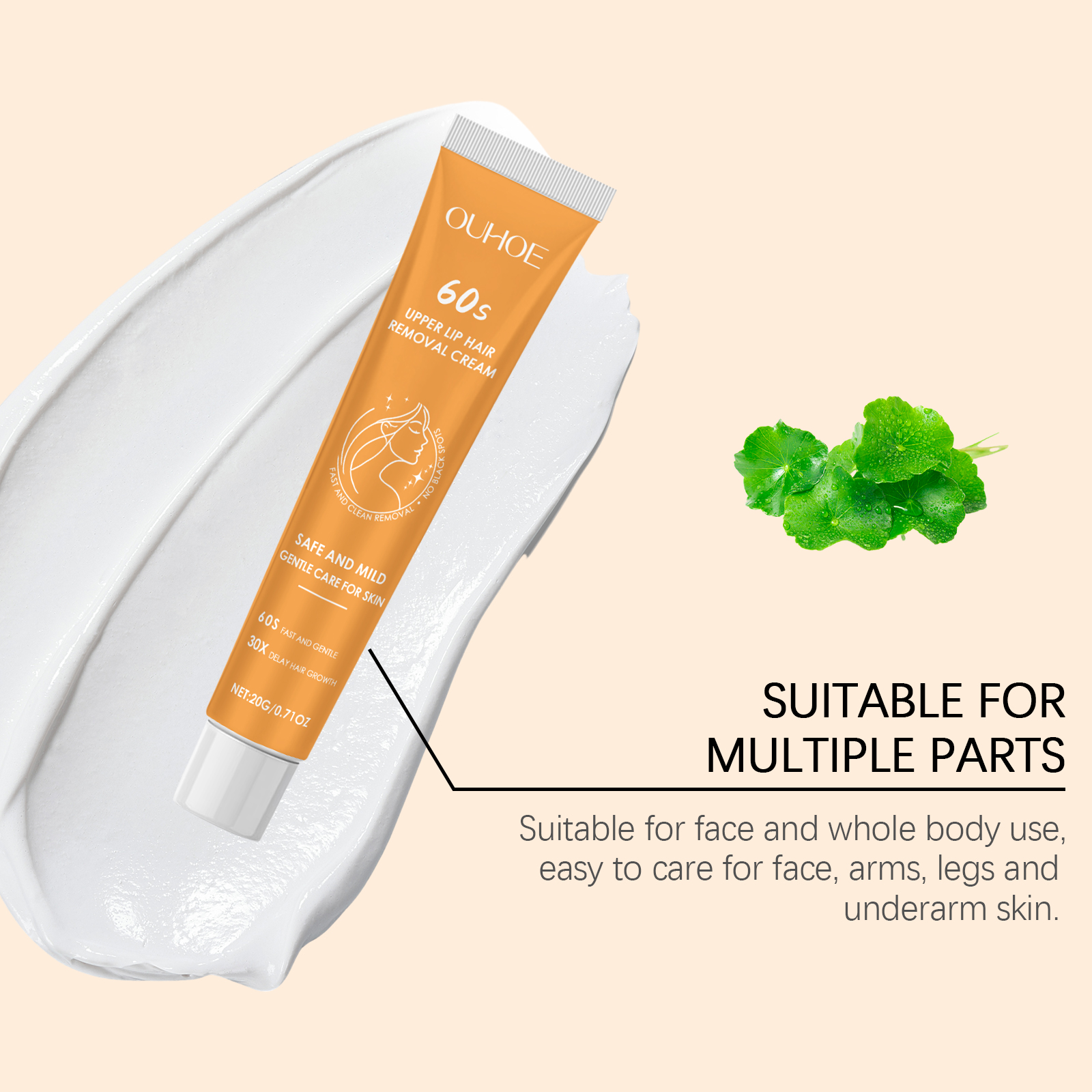 Our body and facial hair removal creams contain deionized water and glycerin. It softens hair quickly, easily removes excess hair, and keeps skin smooth. Moisturize dry skin, reduce itchiness, and enhance post-use comfort. The way to use it is simple: clean the skin and keep it dry. Apply an appropriate amount of this product evenly to the beard around the lips or other skin on the body that needs to be waxed and leave it on for 5-10 minutes. Rinse well with water. And it can effectively delay hair growth and keep the smooth effect longer.