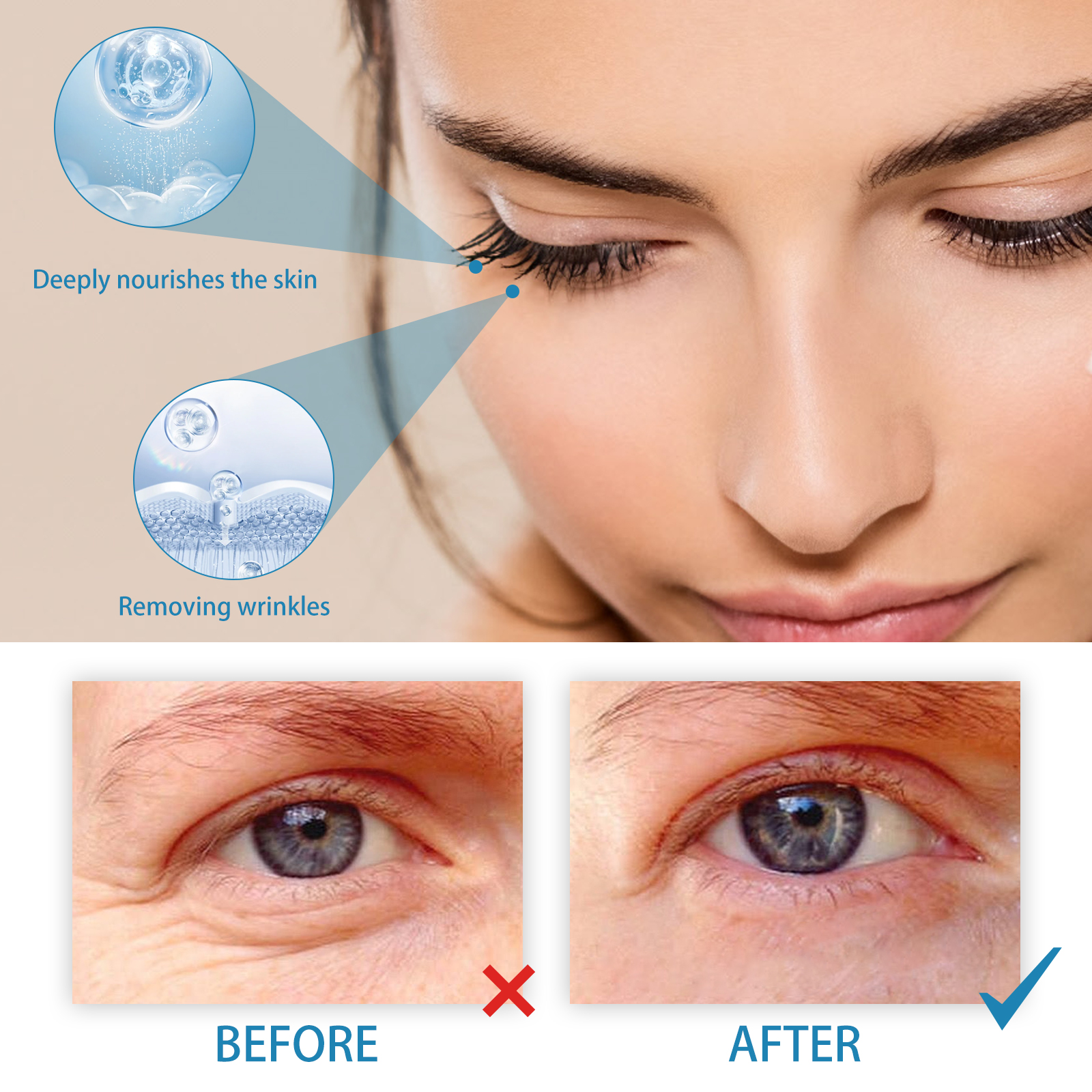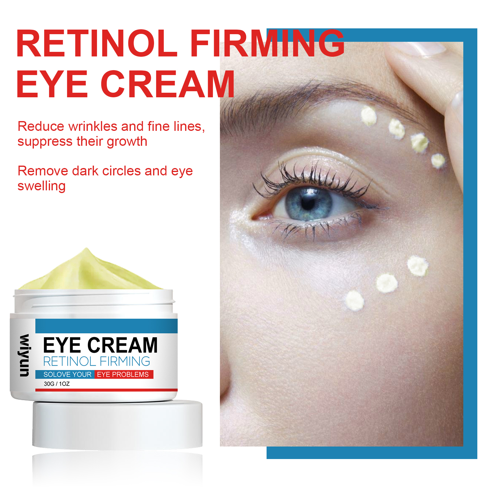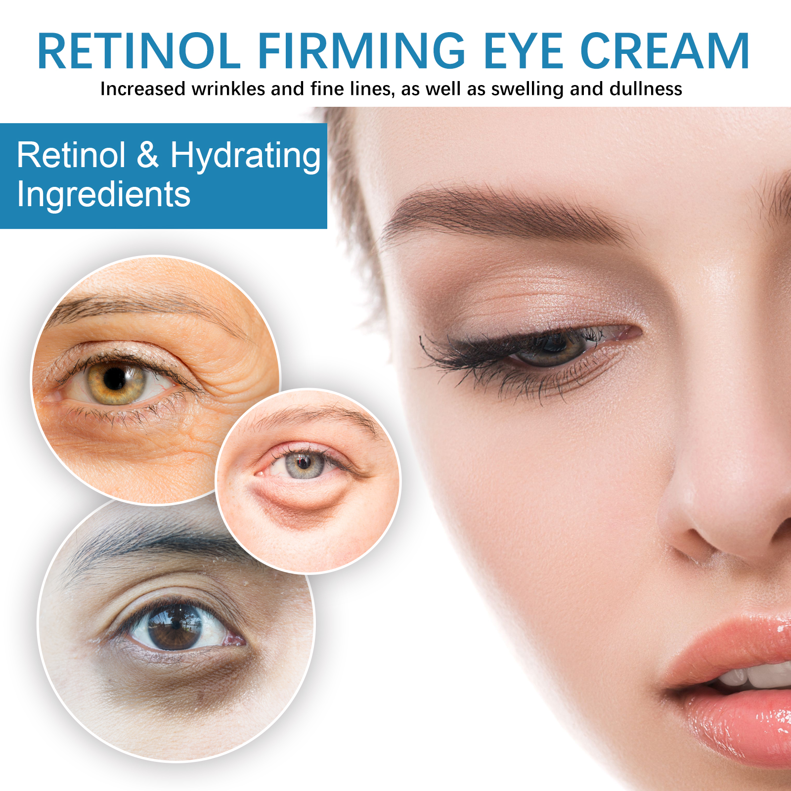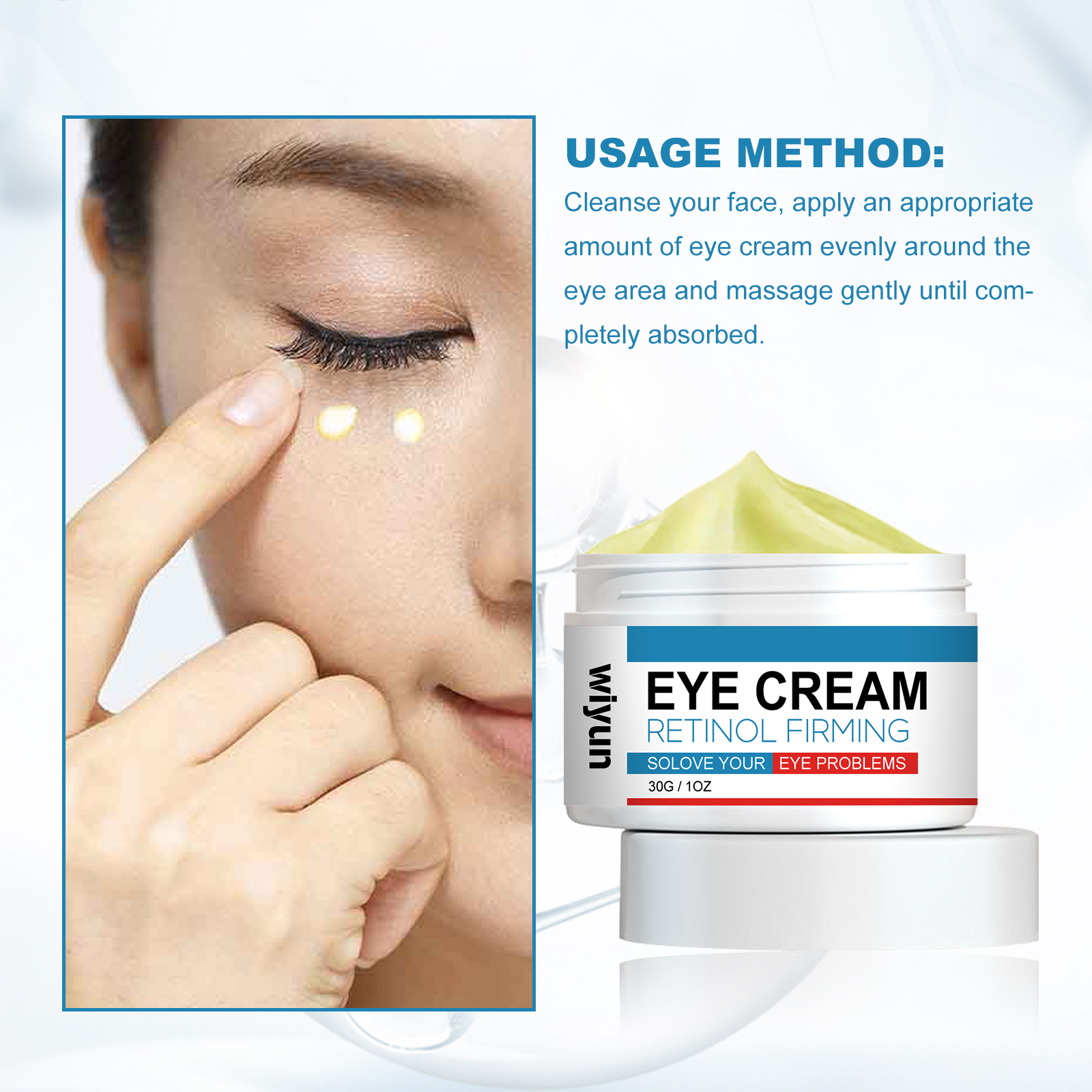 Our retinol anti-wrinkle eye cream contains retinol, collagen, and hyaluronic acid. It reduces wrinkles and fine lines, inhibits their growth, and eliminates dark circles and puffiness under the eyes. Its use method is very simple: after cleansing, take appropriate amount of eye cream evenly apply around the eyes, gently massage until completely absorbed. Retinol Eye cream improves dull skin around the eyes and makes the skin around the eyes brighter. Mild ingredients suitable for all skin types, including sensitive skin.