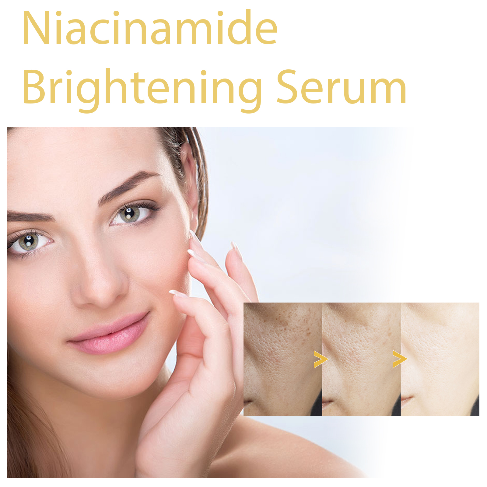 Our Niacinamide Brightening Serum contains nicotinamide, glutathione and hyaluronic acid. It can effectively improve dull skin tone and uneven skin tone, deeply hydrating and moisturizing, and make skin glow. Its use method is very simple: after cleansing and toning, press 1-2 pumps of essence evenly apply to the face skin, and gently massage with your hand until absorbed. It can effectively reduce facial blemishes, lighten fine spots, refine pores, improve dry skin, and replenish moisture for skin.