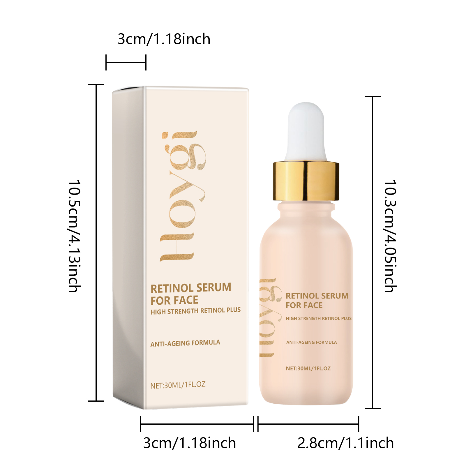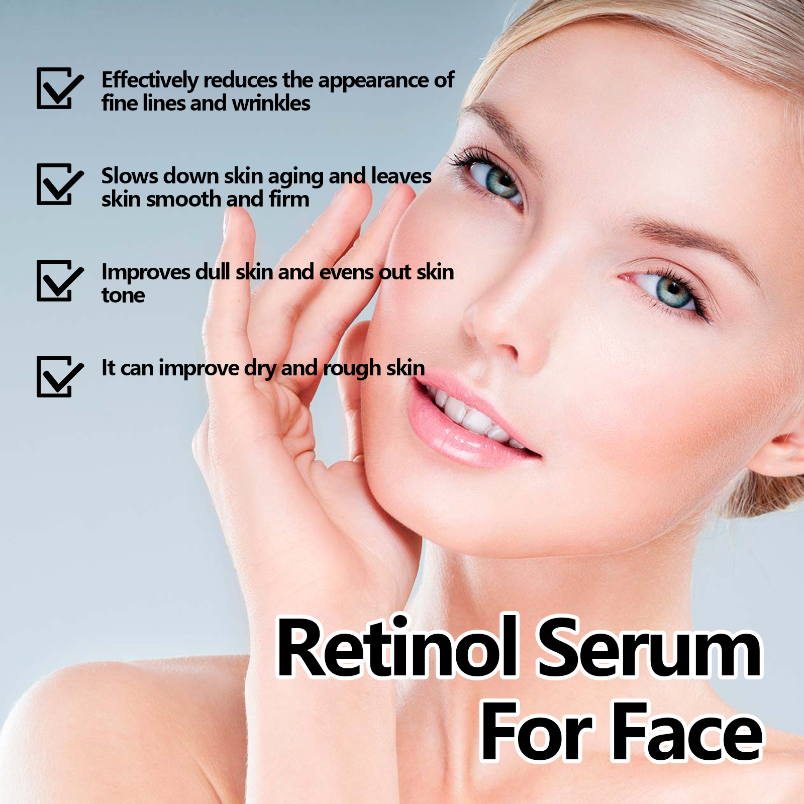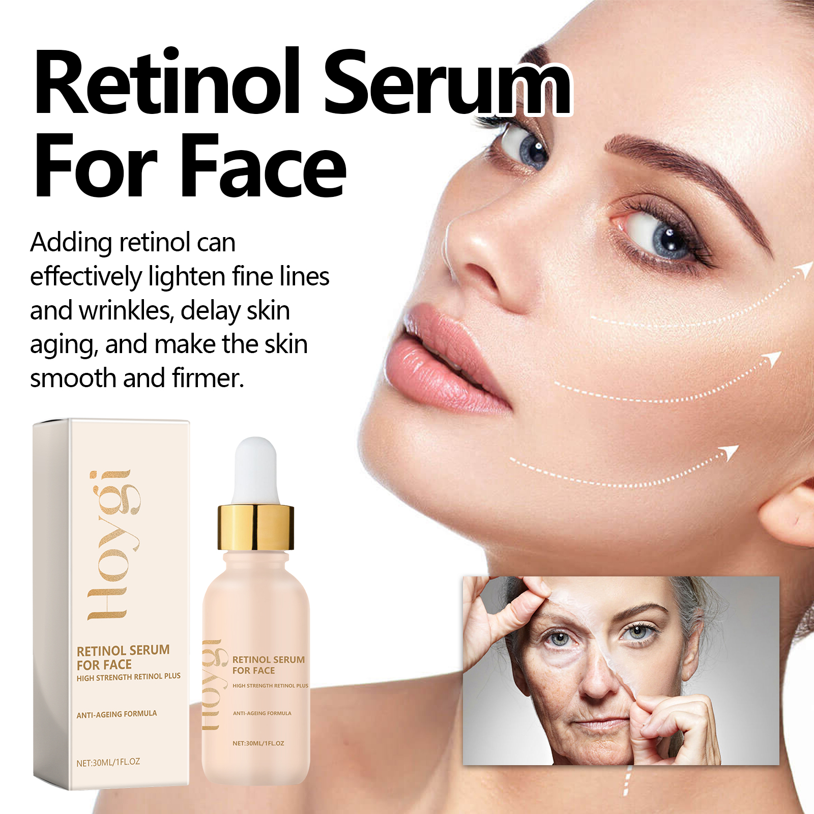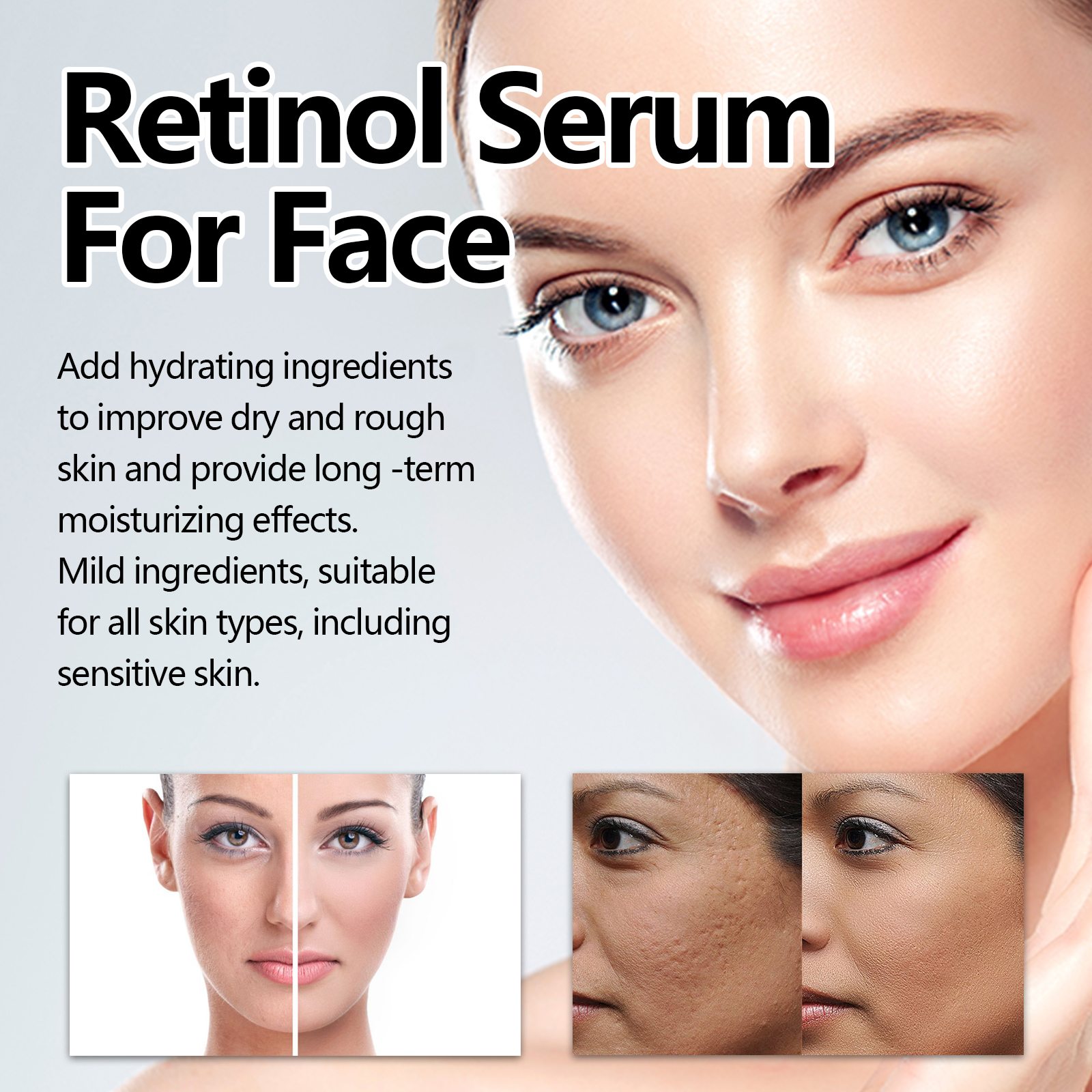 Our Retinol Serum For Face contains Glycerin, Ascorbic Acid, Hyaluronic Acid. It can effectively reduce fine lines and wrinkles, delay skin aging, make skin smooth and firm, improve dull skin, and make your skin tone more even and shiny. Its application method is very simple: use a dropper to take an appropriate amount of essence evenly drop on the face skin, gently massage until completely absorbed. Can improve dry rough skin, provide long-term moisturizing effect, mild ingredients, suitable for all skin types, including sensitive skin.