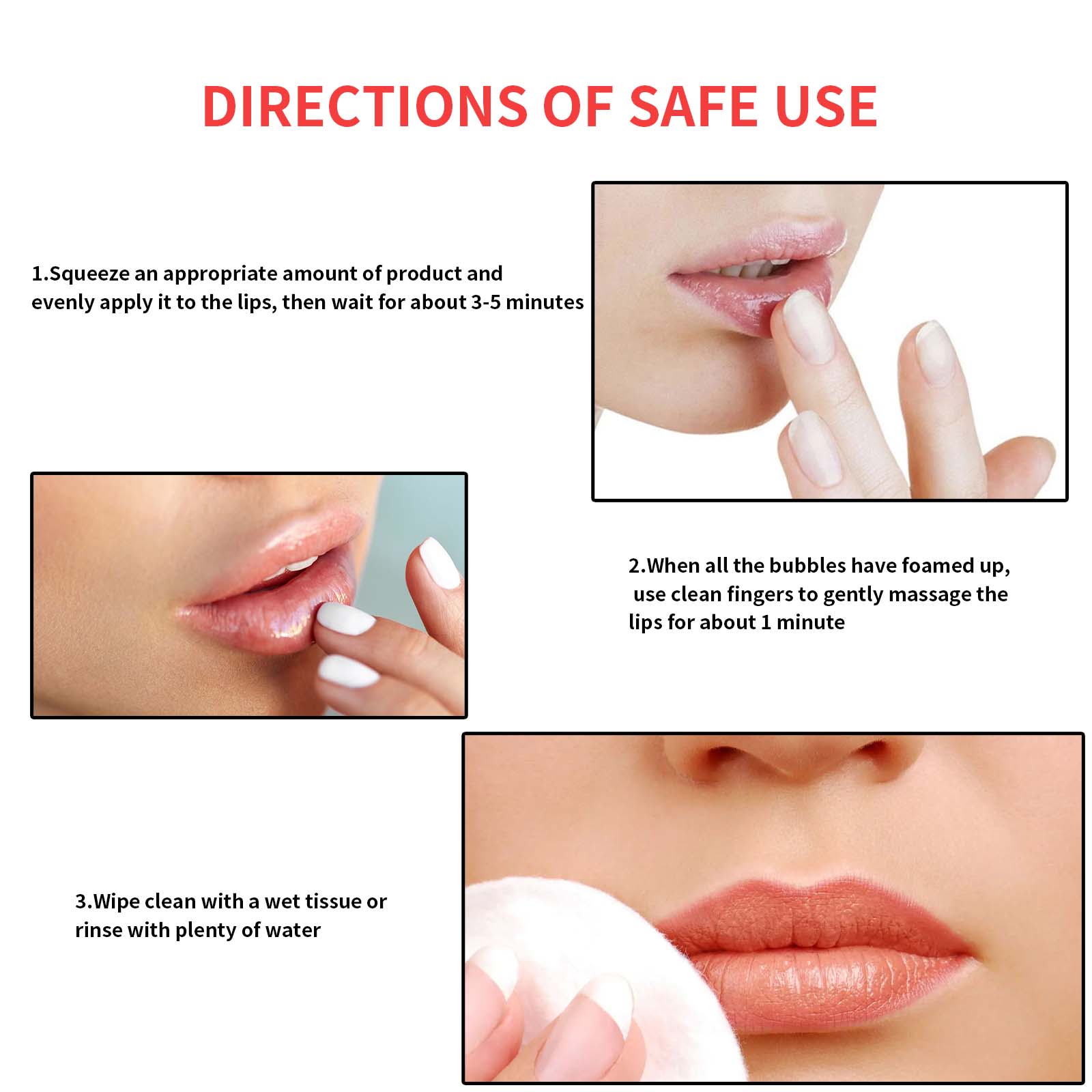 Our Lip Rejuvenation Bubble Mask contains Beeswax, Dracaena Marginata Leaf/Stem Extract, Zingiber Officinale (Ginger) Root Oil. It can relieve redness and discomfort caused by dry or damaged lips, restore soft and smooth lips, help reduce the appearance of fine lines and wrinkles around the lips, and make the lips look more youthful. Its use method is very simple: squeeze the appropriate amount of product evenly apply on the lips, then wait for about 3-5 minutes, wipe with a wet paper towel or rinse with a lot of water, when all the bubbles are bubbling, gently massage the lips with clean fingers for about 1 minute. It gently exfoliates and removes dead skin cells, leaving lips smoother and more delicate, and keeping them moisturized.