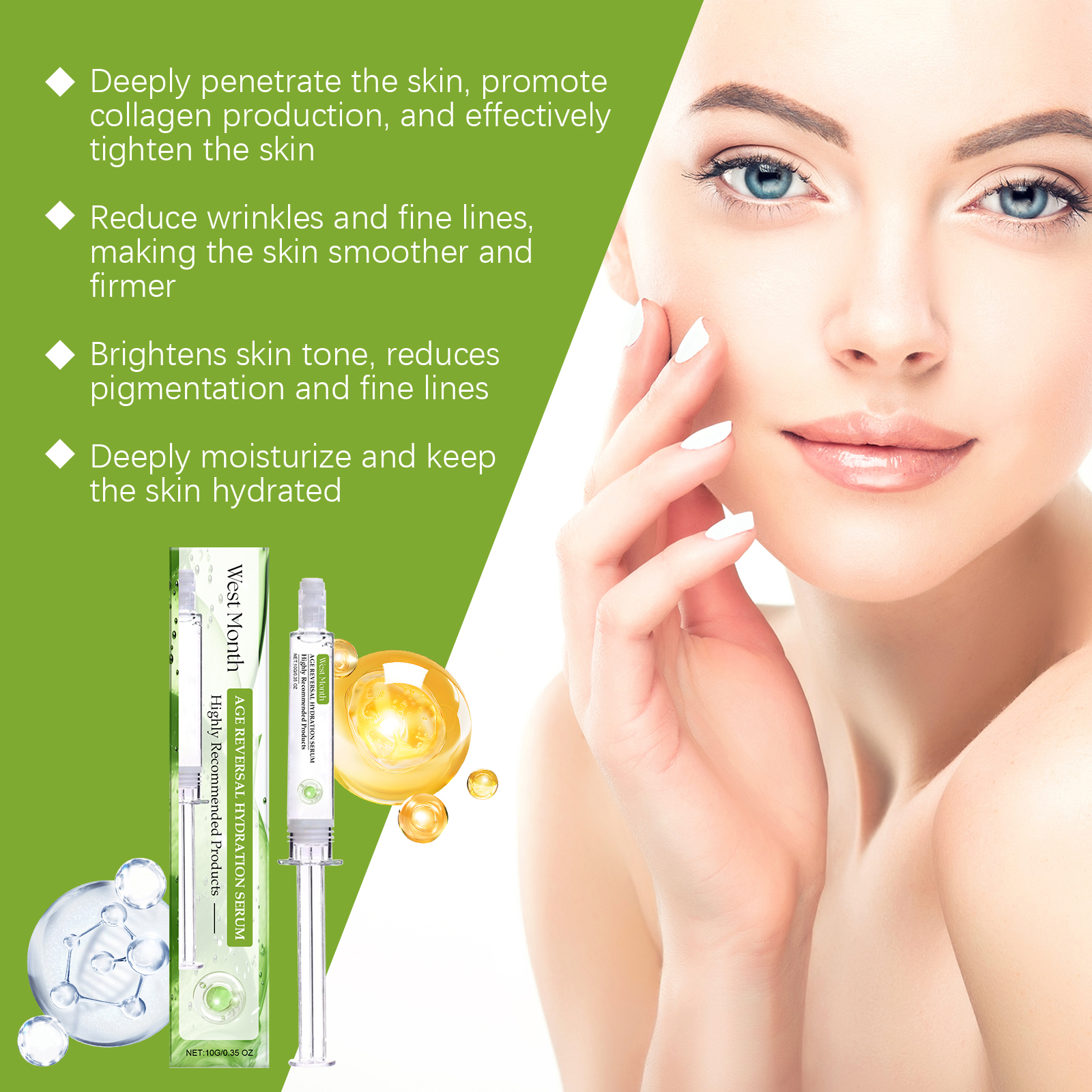 Our anti-aging hydrating serum contains glucan and trehalose. It can improve the overall structure of the skin, make the skin tighter, will not cause skin burden, and has a good long-term use effect. Its application method is very simple: clean facial skin, keep dry, apply appropriate amount of this product evenly on facial skin, massage gently with fingertips until completely absorbed. It is suitable for all skin types, especially those with wrinkles and fine lines.
