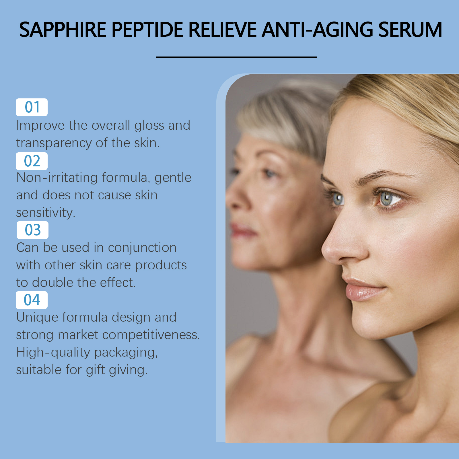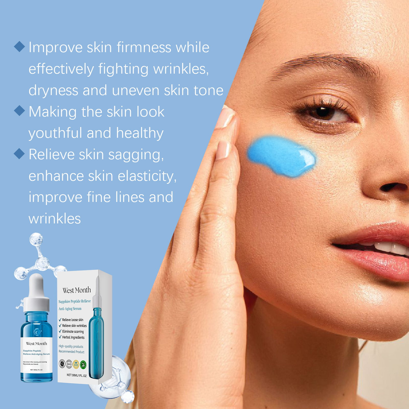 Our firming essence is carefully formulated with aloe vera leaf extract and copper tripeptide-1. Designed specifically for deeply nourishing the skin and restoring its vitality. The usage method is extremely convenient: Clean your face and keep it dry. Take an appropriate amount of the essence and apply it evenly to your face. Gently massage in circular motions with your fingertips until it is fully absorbed. It also features a unique formula design and strong market competitiveness. The high-quality packaging makes it suitable for gifting.