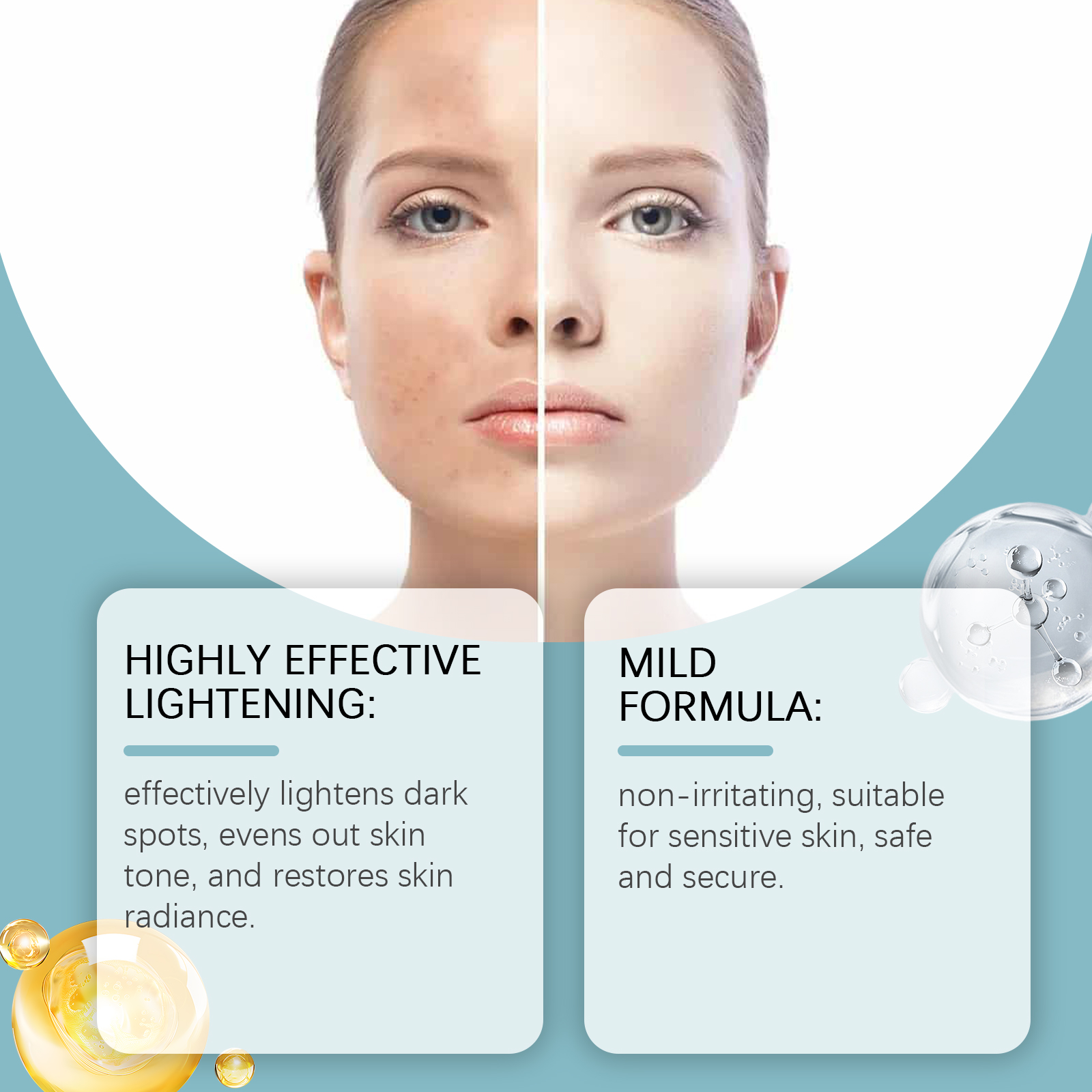 Our brightening serum contains vitamin C and vitamin E. It can easily cope with dull and uneven skin tones. Economical, reduce the cost of facial melanin bleaching care. The way to use it is simple: clean your face and keep dry, apply an appropriate amount of this product evenly on the face, gently massage in circles to promote absorption. And can improve the texture of the skin, make the skin more delicate and smooth.