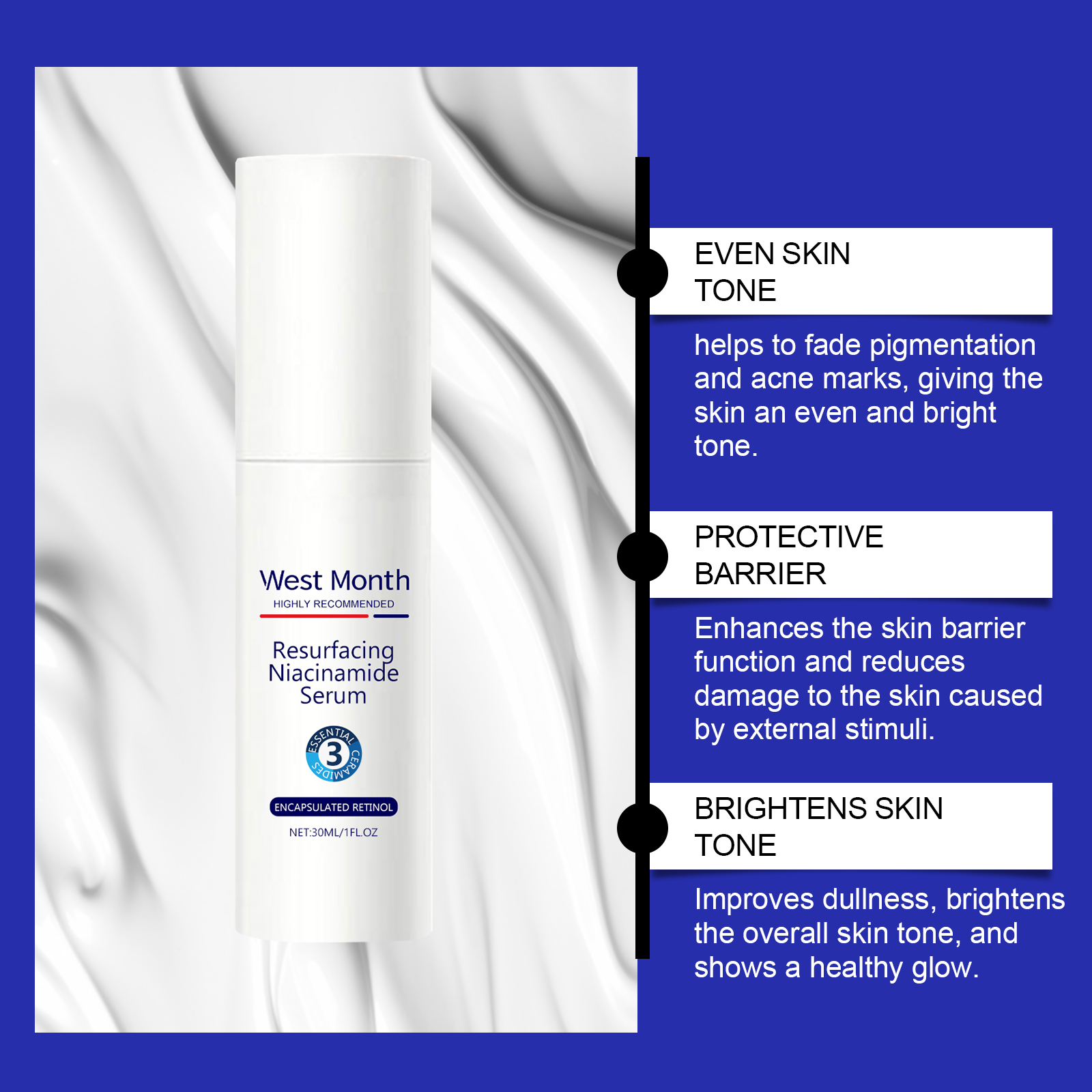 Our niacinamide Refresh Serum contains licorice root extract, niacinamide and retinol. It protects the skin barrier and enhances the skin's ability to repair itself. Its use method is very simple: after cleansing, apply appropriate amount of this product evenly on the face skin, gently massage in circles to promote absorption. And mild formula, suitable for daily use, improve skin health.