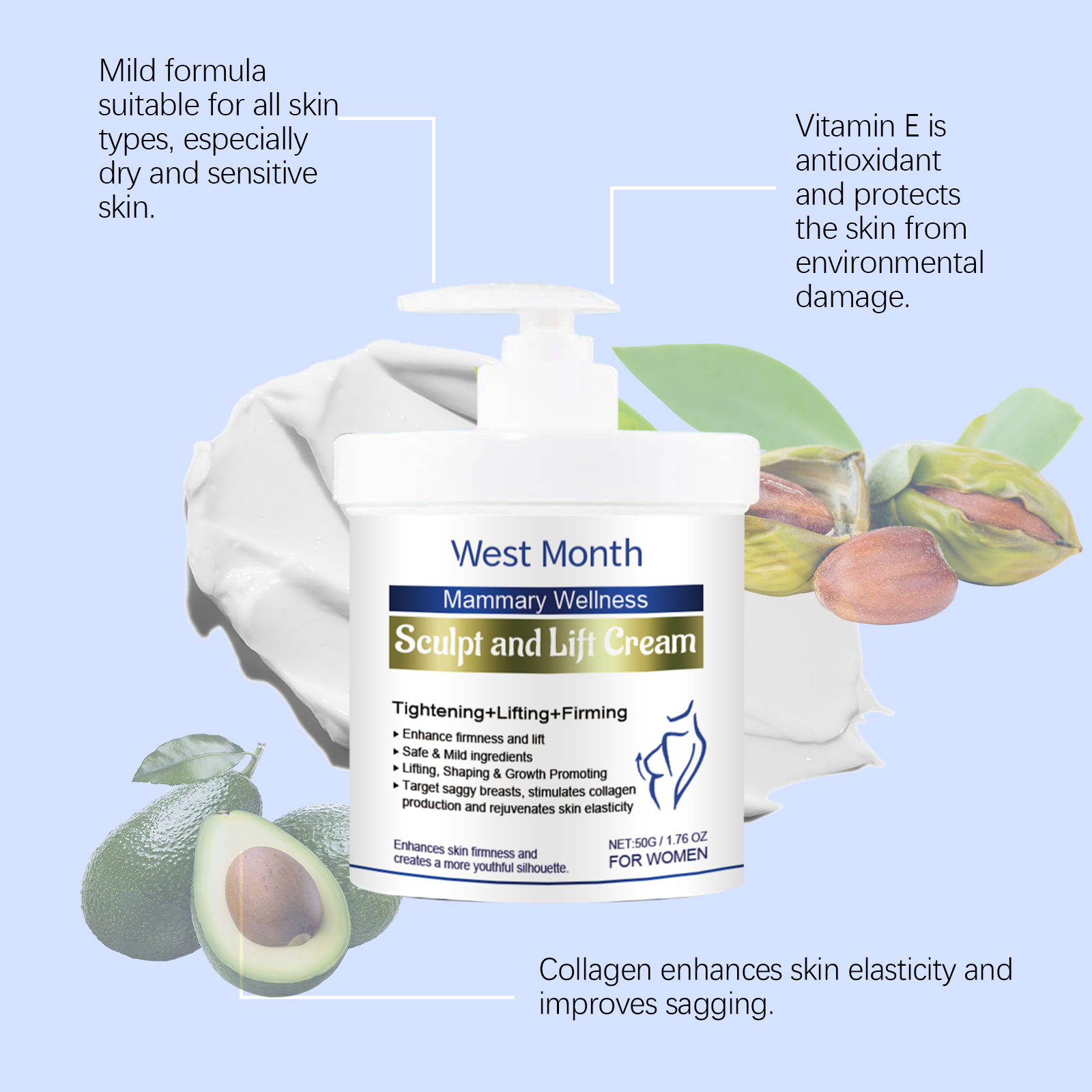 Our breast cream contains Jojoba seed oil, avocado oil, and sodium hyaluronate. It can deeply nourish, repair skin barrier, enhance moisture; Provides long-lasting moisture and leaves skin hydrated and plump. Improves skin elasticity and reduces skin sagging. Its application method is simple: 1. Clean the skin and keep it dry. 2. Apply an appropriate amount of the cream evenly to the chest, neck, arms and other areas, avoiding the nipples as much as possible; 3. Massage upward with your fingertips to promote absorption. Rich oil ingredients moisturize the skin, improve dryness and flabby skin.