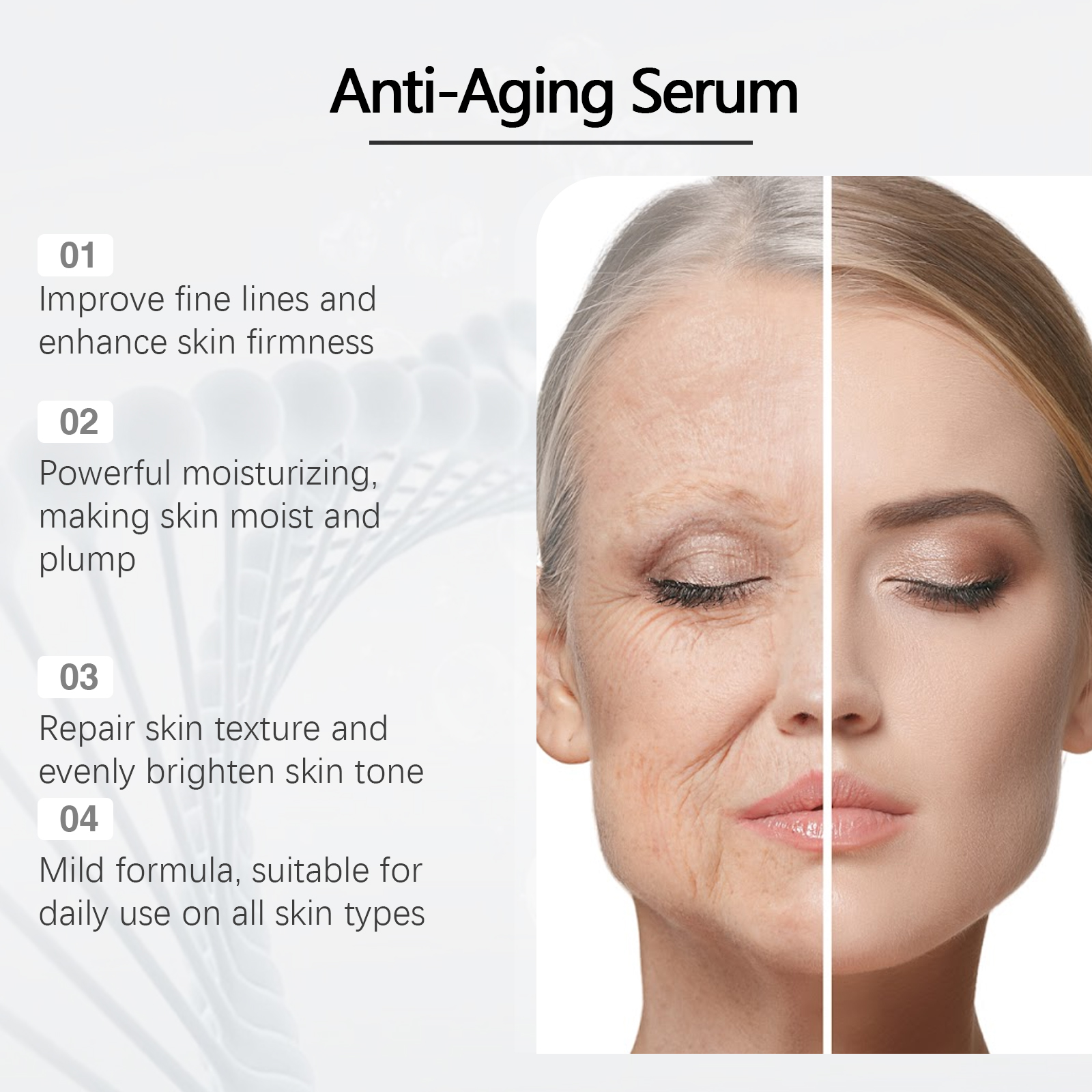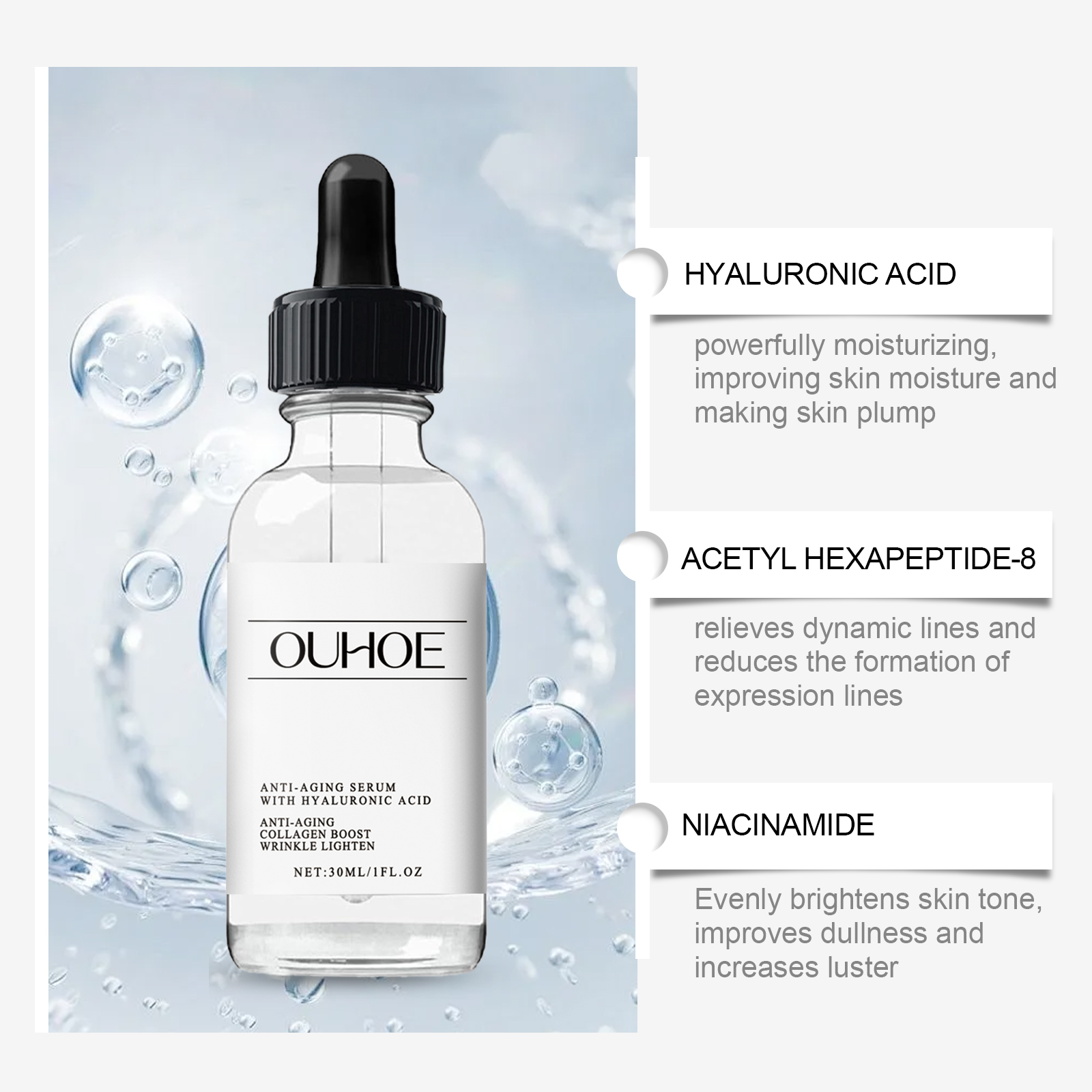 Our polypeptide facial serum contains niacinamide, collagen. It acts as a powerful moisturizer, leaving skin hydrated and plump. Its application method is very simple: clean the facial skin, keep the skin dry, apply the appropriate amount of essence evenly on the facial skin, gently massage until completely absorbed. And can effectively reduce fine lines, enhance skin elasticity, improve relaxation