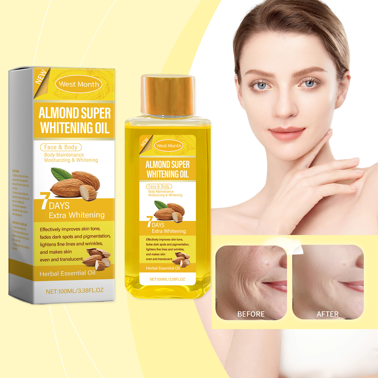 Our sweet Almond body brightening oil contains vitamin C, hyaluronic acid. It can even out skin tone, improve skin whitening and luster, and show healthy skin. The way to use it is simple: clean the skin and keep it dry. Take appropriate amount of essential oil and evenly apply to the parts that need care, such as face, shoulders, arms, thighs, etc. Massage gently to promote absorption. And can effectively enhance the skin gloss, keep the skin shine for a long time.