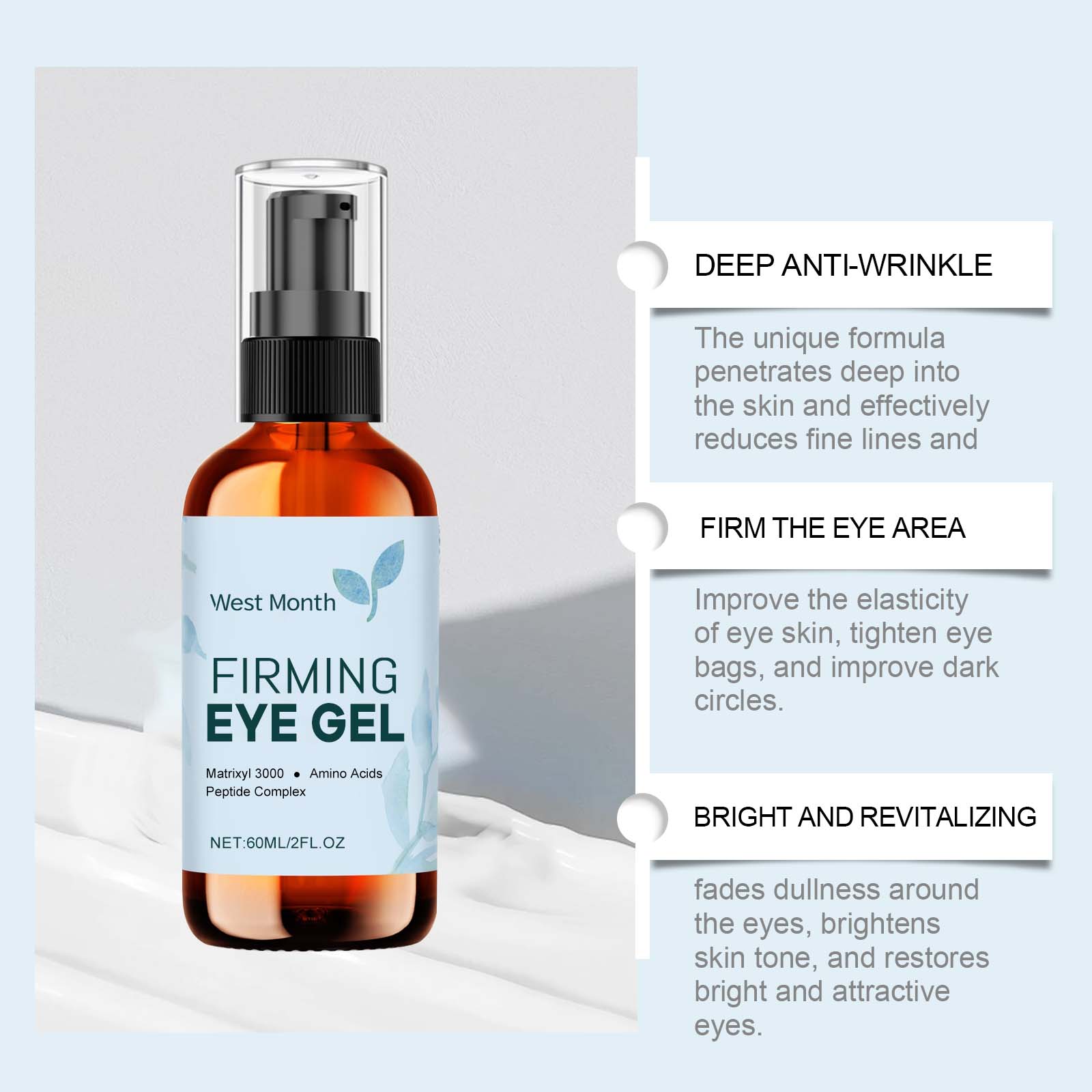 Our eye care gels contain glycerin, carbomer. It can be uniquely formulated to penetrate deep into the skin and effectively reduce fine lines and wrinkles. Improve the elasticity of the skin around the eyes, tighten the bags under the eyes, and improve the black eye roll. Its application method is very simple: thoroughly clean the face and eye skin, and dry it, take a proper amount of this product evenly spoon on the eye. Finally, gently massage to promote absorption. It can also smooth the fine lines around the eyes and make the skin smoother and more delicate.