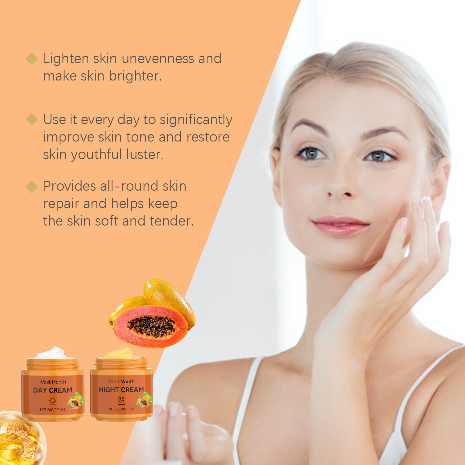 Our papaya facial cream contains day cream: papaya fruit extract, ascorbic acid (vitamin C); Night cream: papaya fruit extract, niacinamide. It can help even out the complexion and make the skin glow. Long-term use helps to reduce spots and return the skin to an even and bright state. Its application is simple: clean your face in the morning and keep it dry. Take a suitable amount of day cream and apply it evenly to your face. Massage gently to fully absorb. Cleanse your face at night and keep it dry. Apply appropriate amount of night cream to face evenly. Massage gently to fully absorb. It can also make your skin look brighter, more transparent and more radiant.