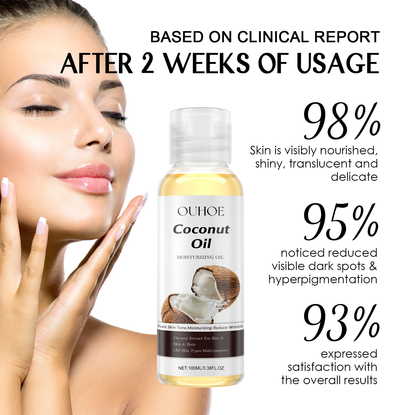 Our coconut oil contains mineral oil, coconut oil. It can obviously nourish the skin, shine, transparent, delicate, reduce visible dark spots and pigmentation, improve facial skin relaxation, moisturize and reduce oil, make the skin balance. Its use method is very simple: after cleansing, take appropriate amount of essential oil evenly apply to the skin, gently massage until absorbed. Coconut oil equalizes skin tone, reduces cuticles, deeply moisturizes skin, and makes skin shine.